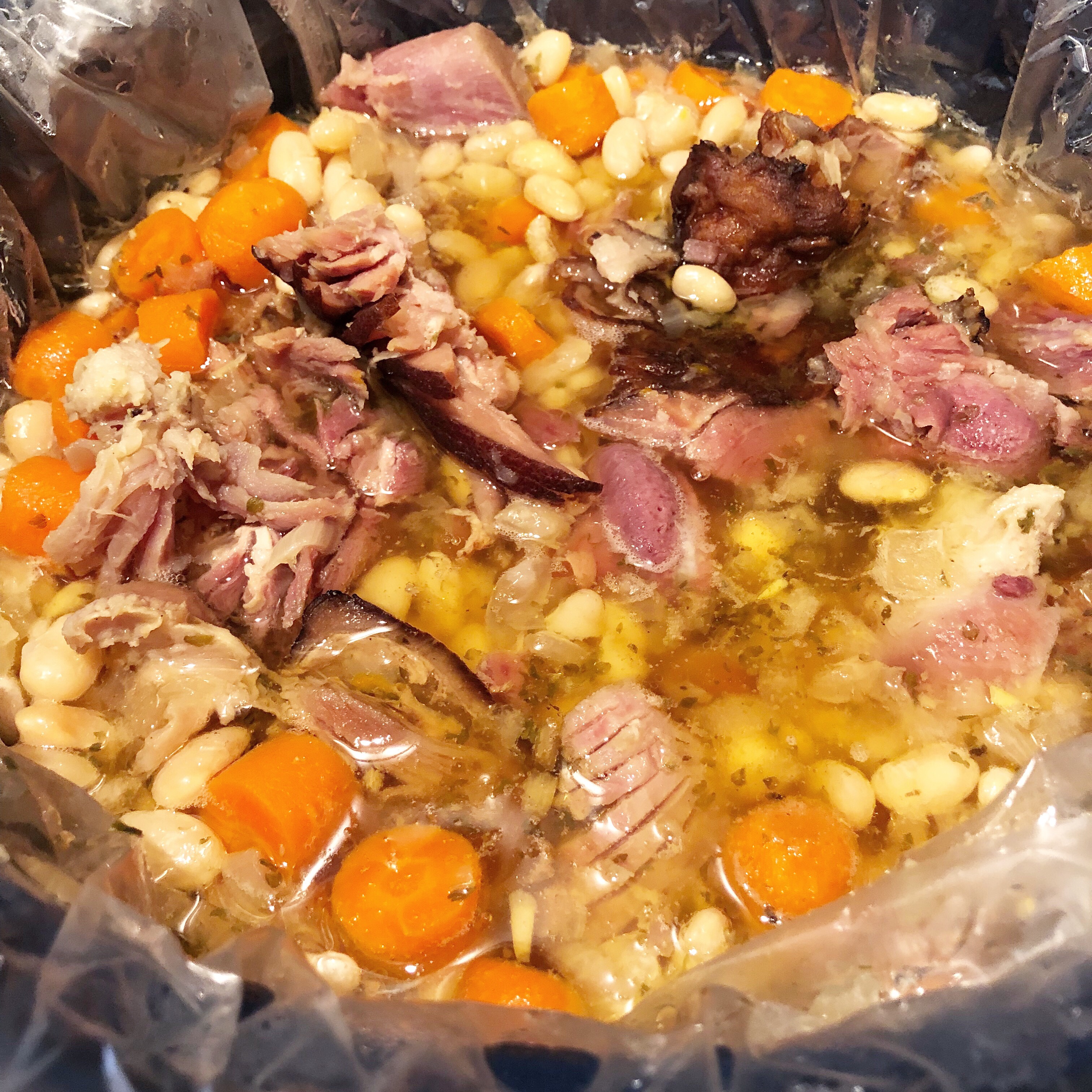 I didn’t even soak the Great Northern beans overnight. I rinsed and sorted them just before I put everything in the slow cooker! I also used a slow cooker liner to make cleanup easier. This is such a forgiving recipe when it comes to the amount of each ingredient – just fill your slow cooker about 3/4 of the way full and your soup will be wonderful!