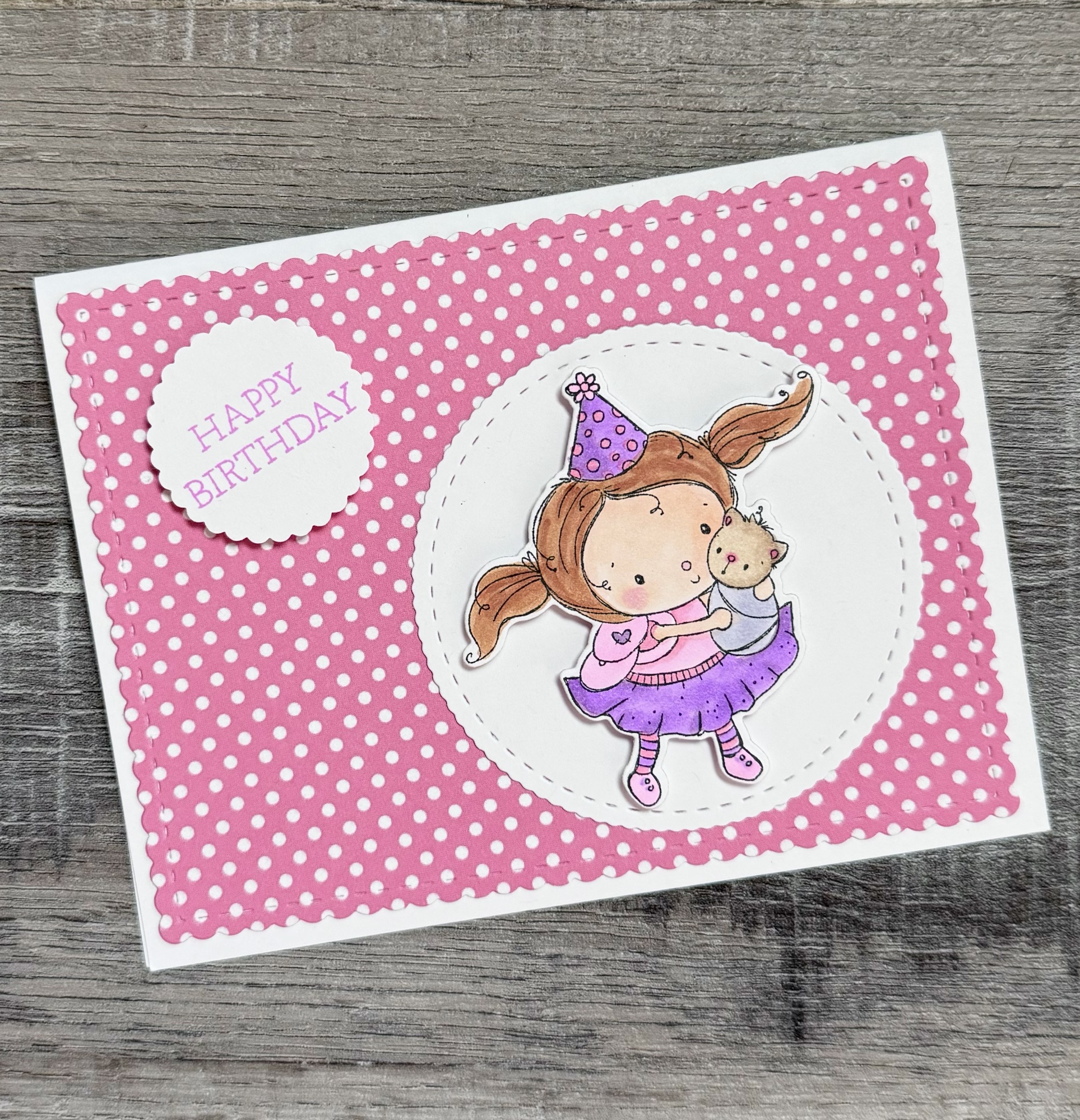 The stamp set used in the card below is called Birthday Squeeze and has matching dies. After stamping and coloring the birthday girl, I used the matching die to cut around the image. I stamped the sentiment with pink ink on white card stock and punched it with a scalloped circle punch.