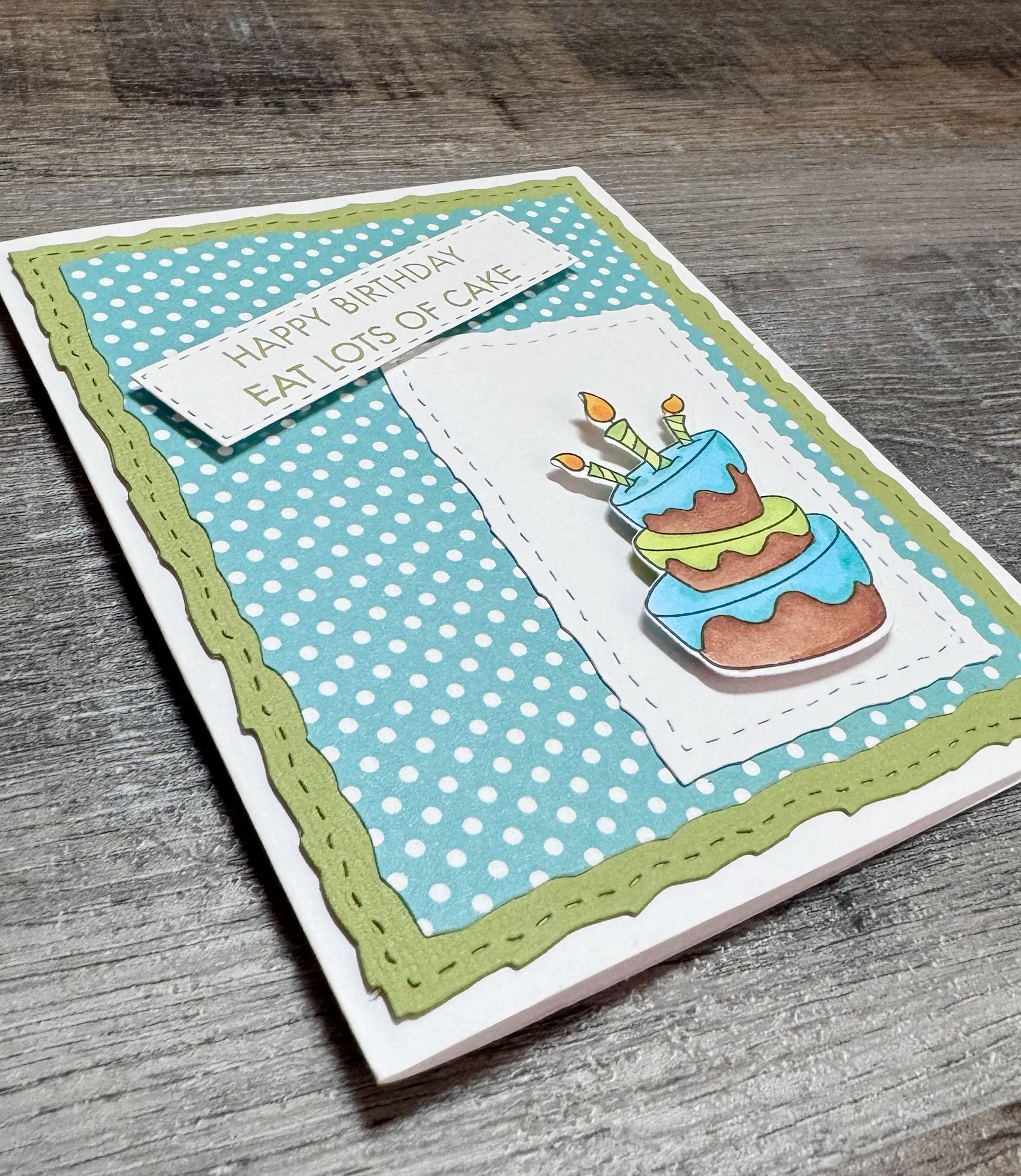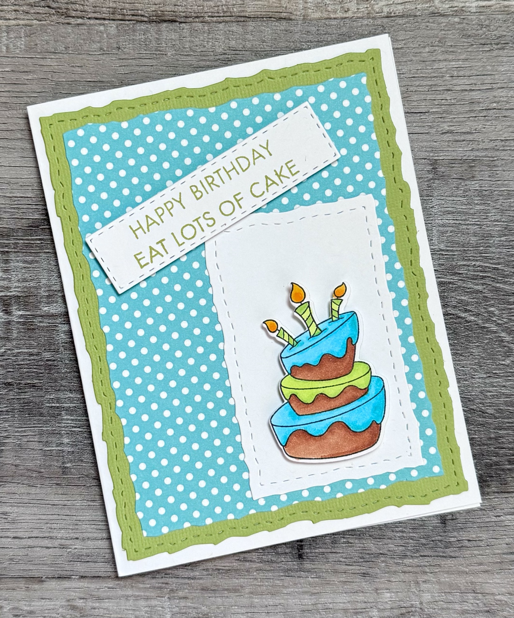 The images in the 2 cards below are from the Eat Lots of Cake stamp set from My Favorite Things. After stamping and coloring the images, I die cut them with the matching dies. I used the Deckle & Stitches Nesting Dies, Scallops & Squares Nesting Dies, and Scalloped & Stitched Sentiment Nesting Dies, all from Unity Stamp Company, on both of the cards for the backgrounds and sentiments. The images and sentiments are attached with foam tape.