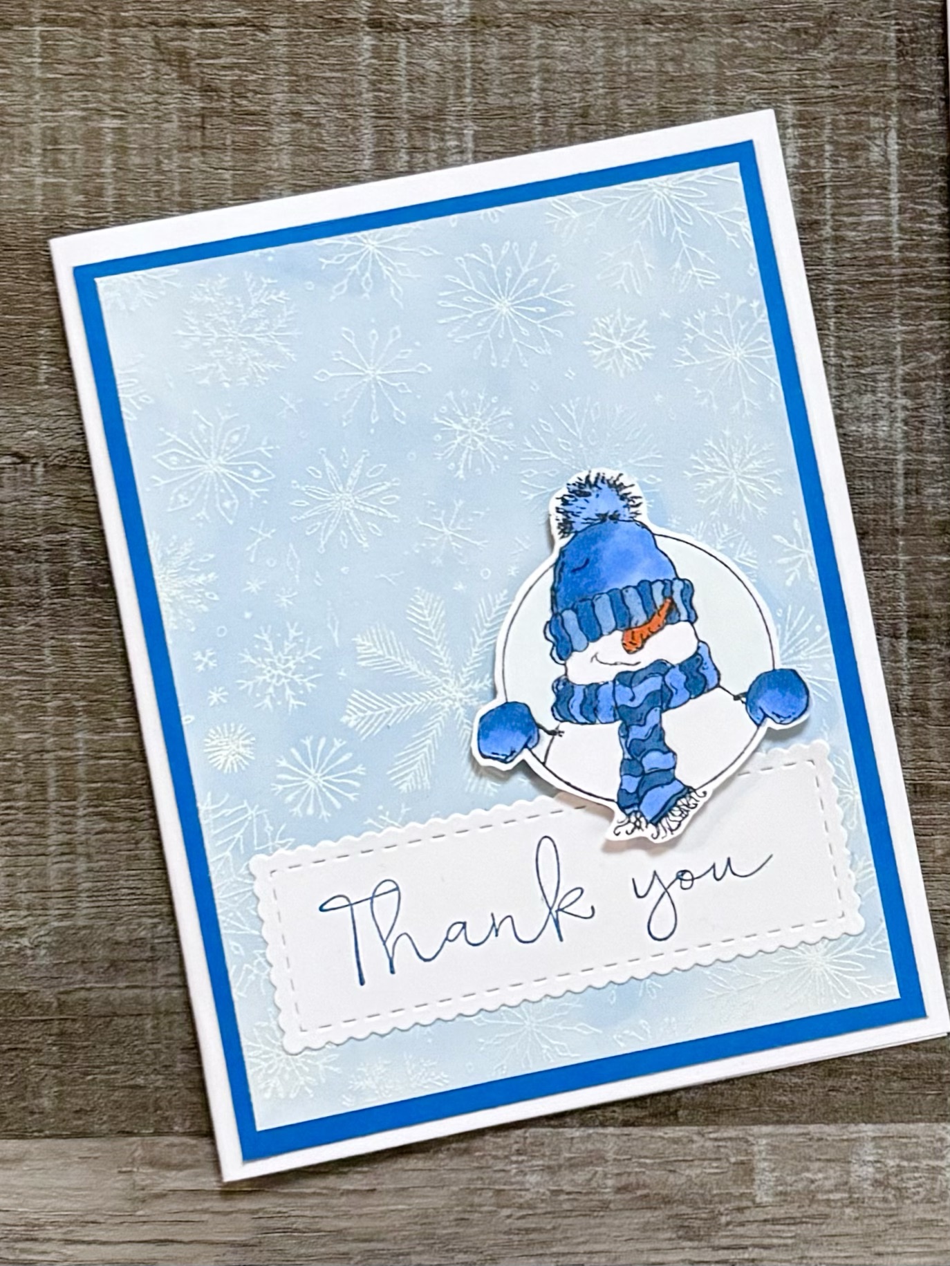 The sentiment is stamped with blue ink on white card stock, die cut with the Scalloped & Stitched Sentiment Nesting Dies from Unity, and attached to the card. The snowman is attached to the card with foam tape.