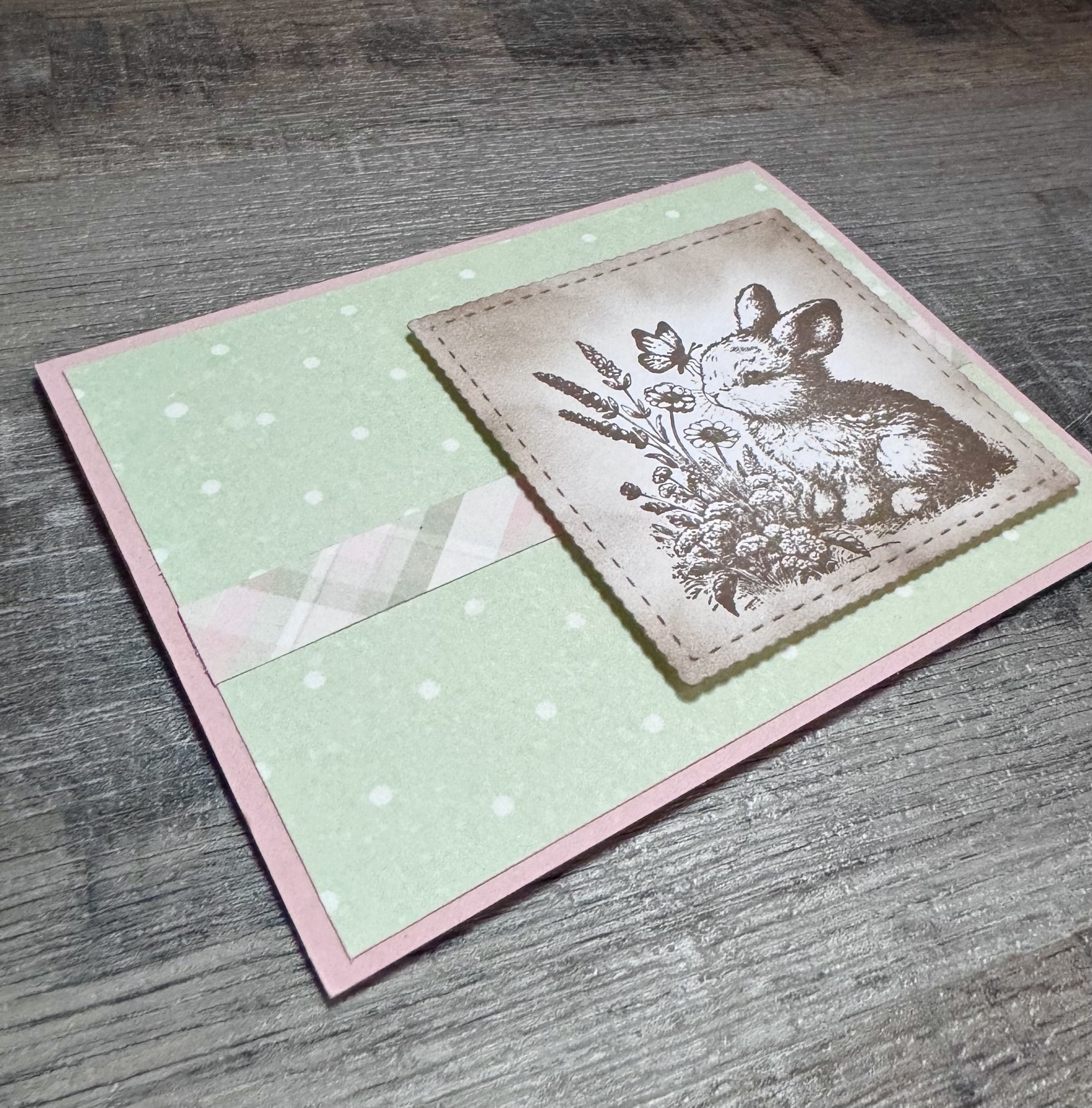 I attached a piece of patterned paper to a salmon colored card and added a strip of coordinating patterned paper. The bunny image is attached to the card with foam tape. And that’s it!