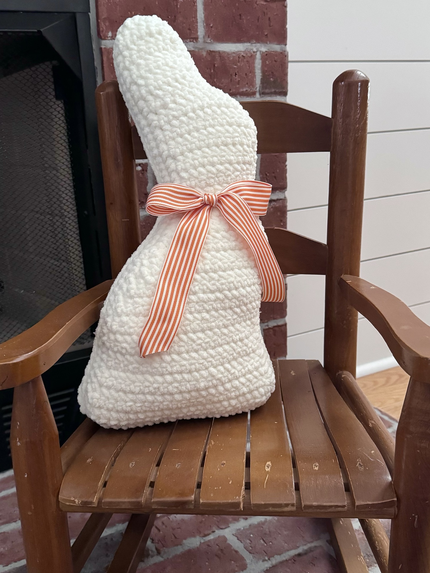 I stitched up my Plush White Chocolate Bunny using Baby Bee Snugs & Kisses yarn in Vanilla Bean with a J/6mm crochet hook. Youβll need an 8 ounce skein of the (6) super bulky yarn along with Poly-fil stuffing to make your bunny. I tied on a sweet bow with orange and white striped ribbon to give her a little color.
