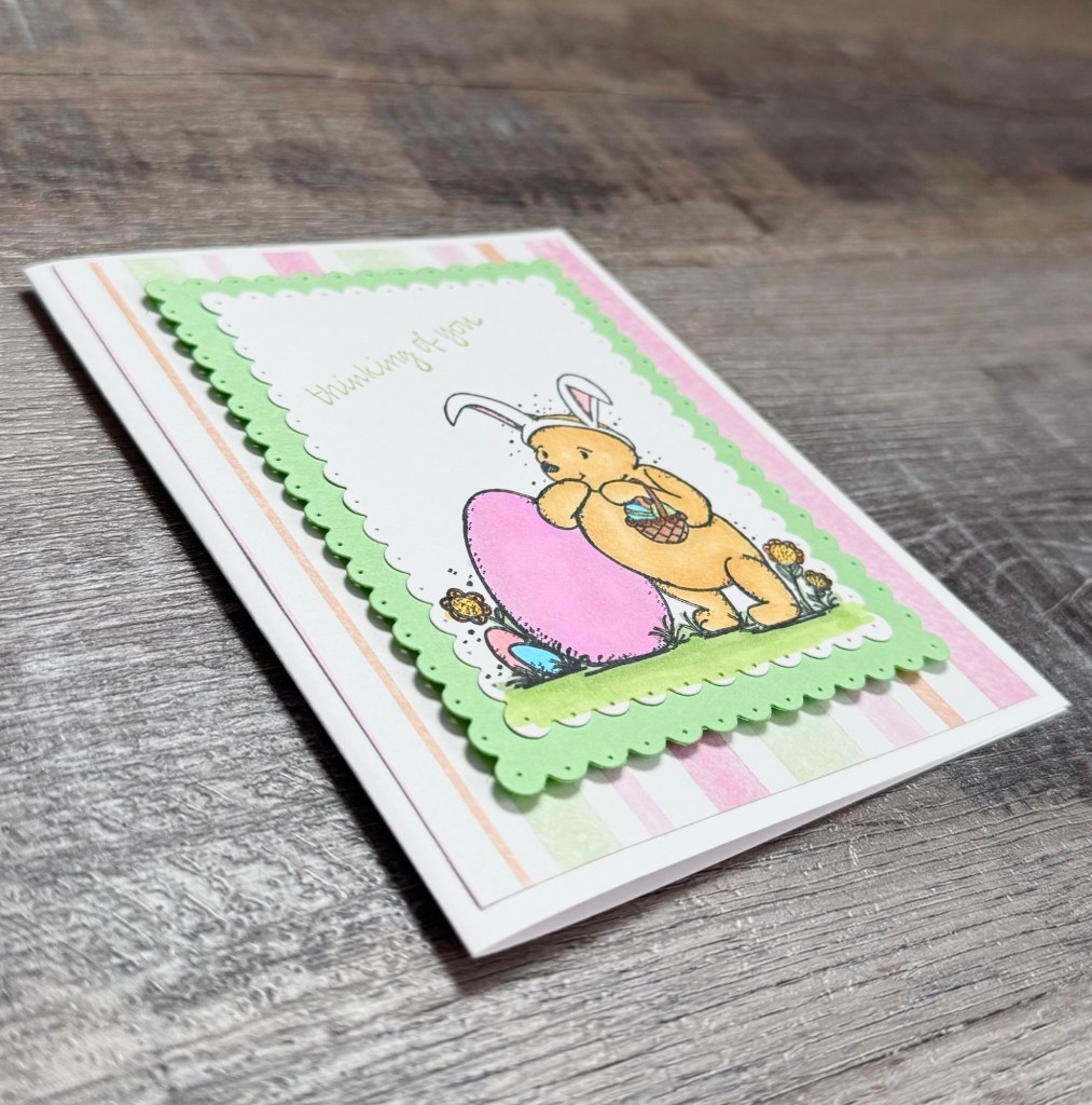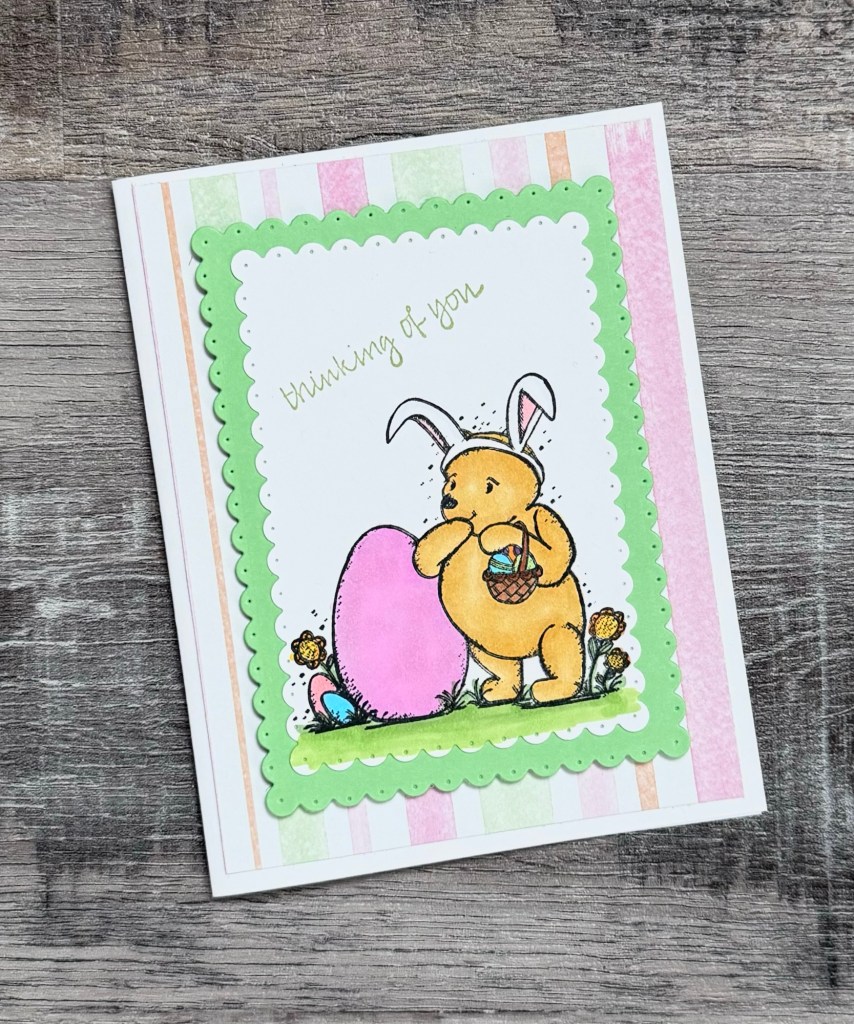 I stamped my “thinking of you” sentiment with green ink at an angle above Pooh. This is one of my older stamps. Use your favorite sentiment – or none at all. 😊 I stamped “Happy Easter” on the inside of my card so I wanted something else on the front.