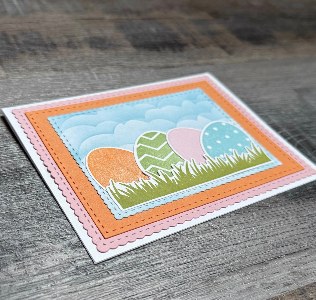 I die cut a piece of white card stock using Scallops & Rectangles Nesting Dies from Unity Stamp Company. I created the clouds using the Cloud Stencil from MFT Stamps. I used a Blender Brush from Taylored Expressions to apply blue ink while repositioning the stencil on the white card stock. I attached the eggs, overlapping them, and then attached the grass.