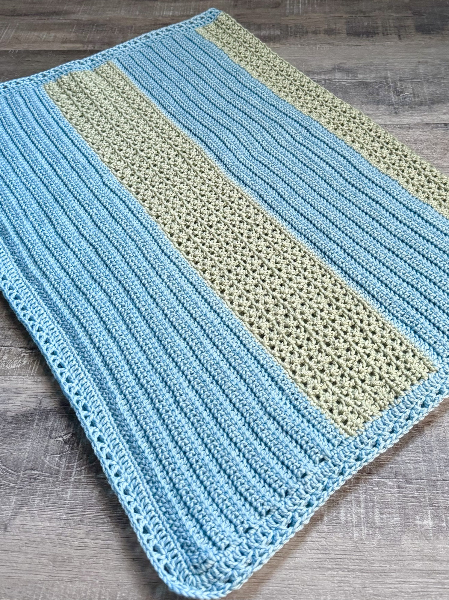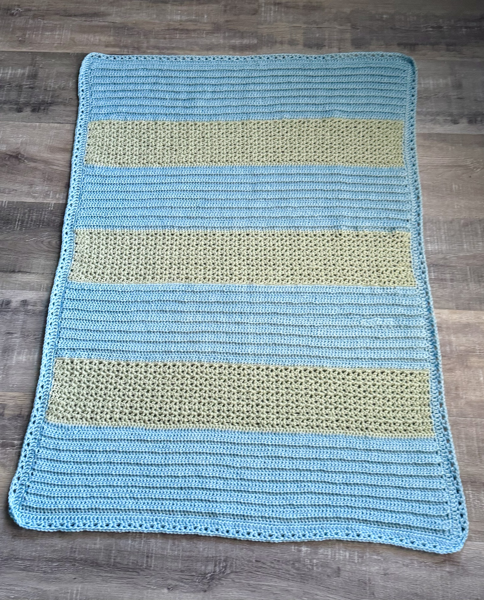 My sister asked me to crochet a blanket for her to give as baby gift and left the choice of pattern and colors up to me. I decided to use my Sunny Dreams pattern, but change it up a bit. I thought it would be cute to make it in 2 different colors. The blanket will be for a new baby boy so I chose blue and green.