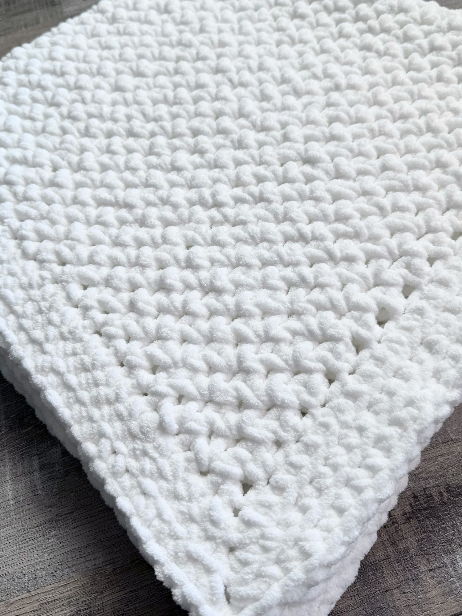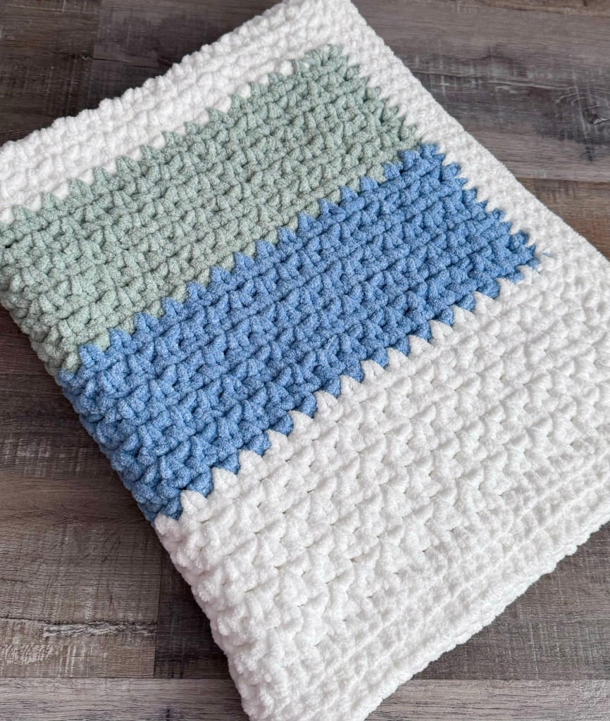 The texture and stitch definition is just beautiful using this super bulky yarn. And the blanket is so cozy and soft – perfect for cuddling! It’s also thick enough to spread out on the floor to use for tummy time. 🙂