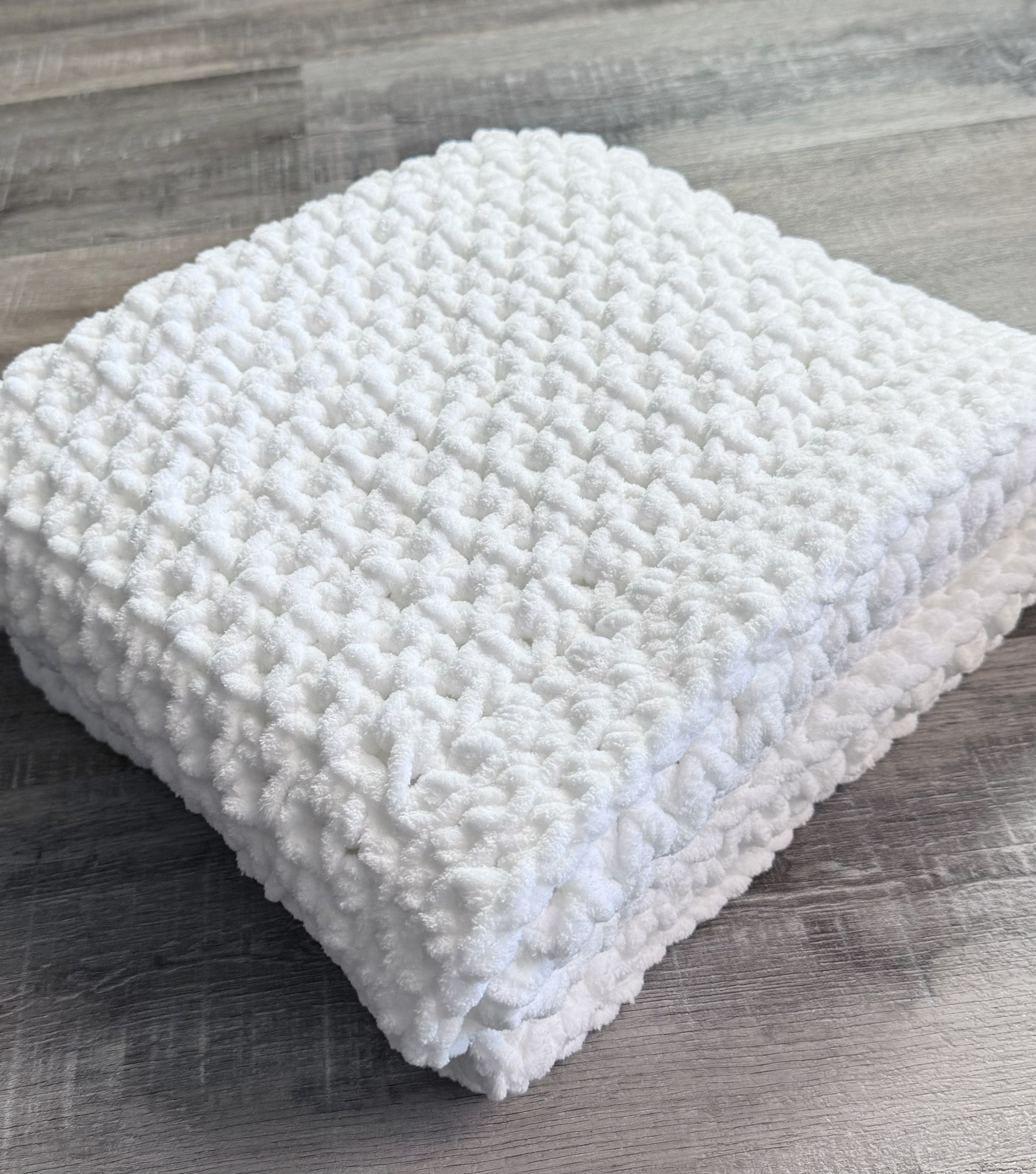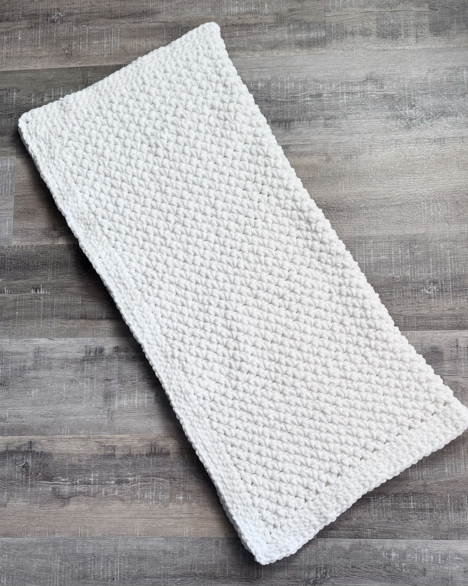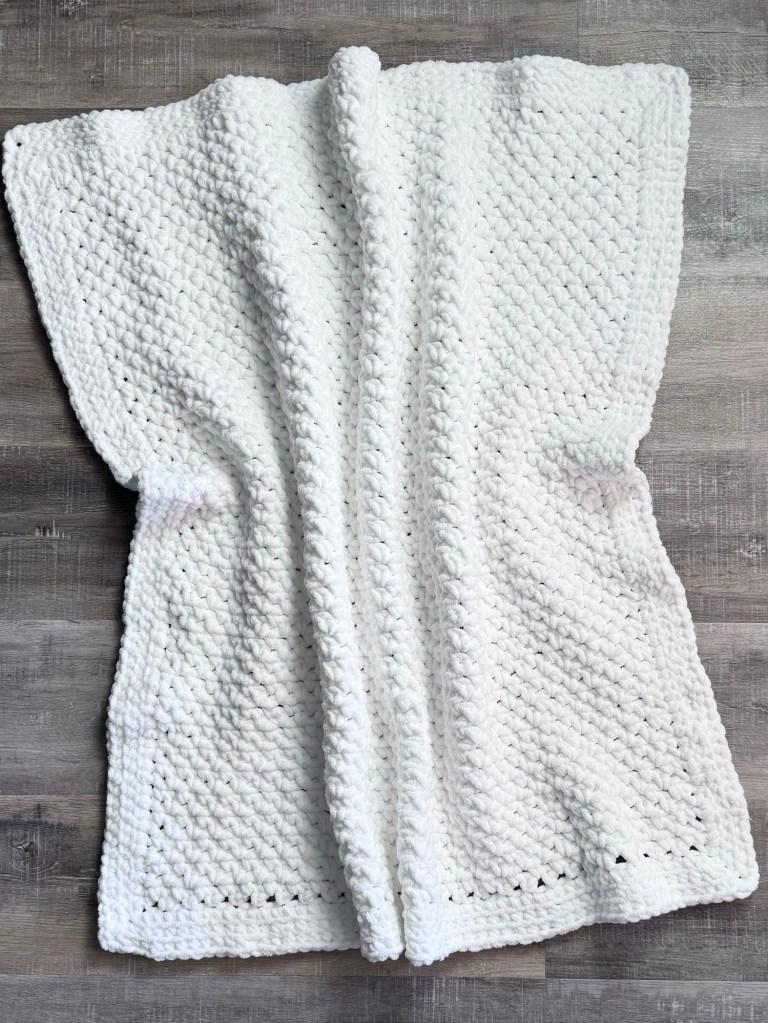 I decided to stitch the blanket up in traditional white and I couldn’t be happier with how it turned out! I used 3 (8 ounce) skeins of Baby Bee Snugs & Kisses yarn in Soft Snowflake with an N/9mm crochet hook to make my blanket.