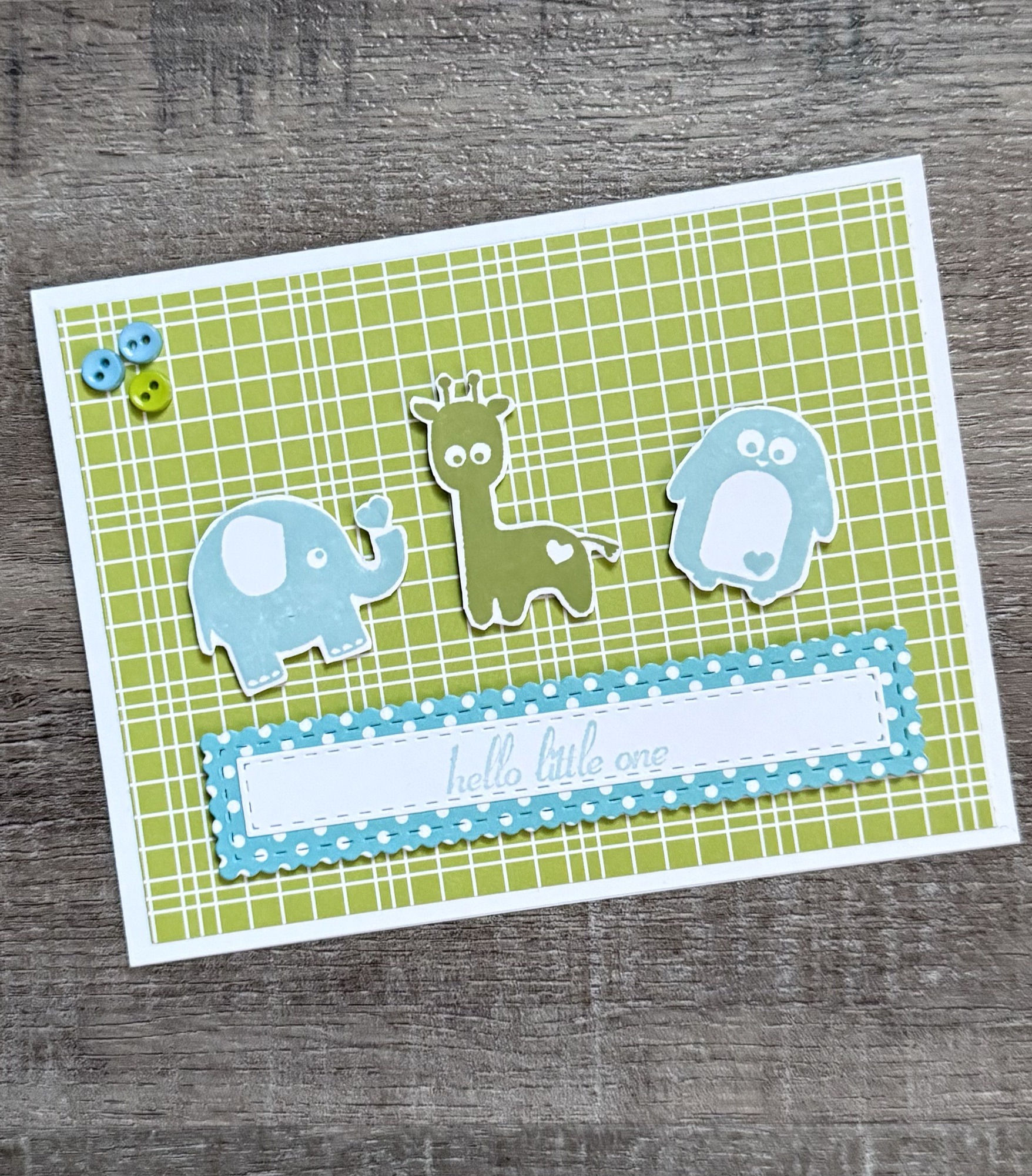 I added a piece of sage patterned paper to a white card. The animals and sentiment are all attached to the card using foam tape. Then I added 3 tiny buttons to the upper left corner.