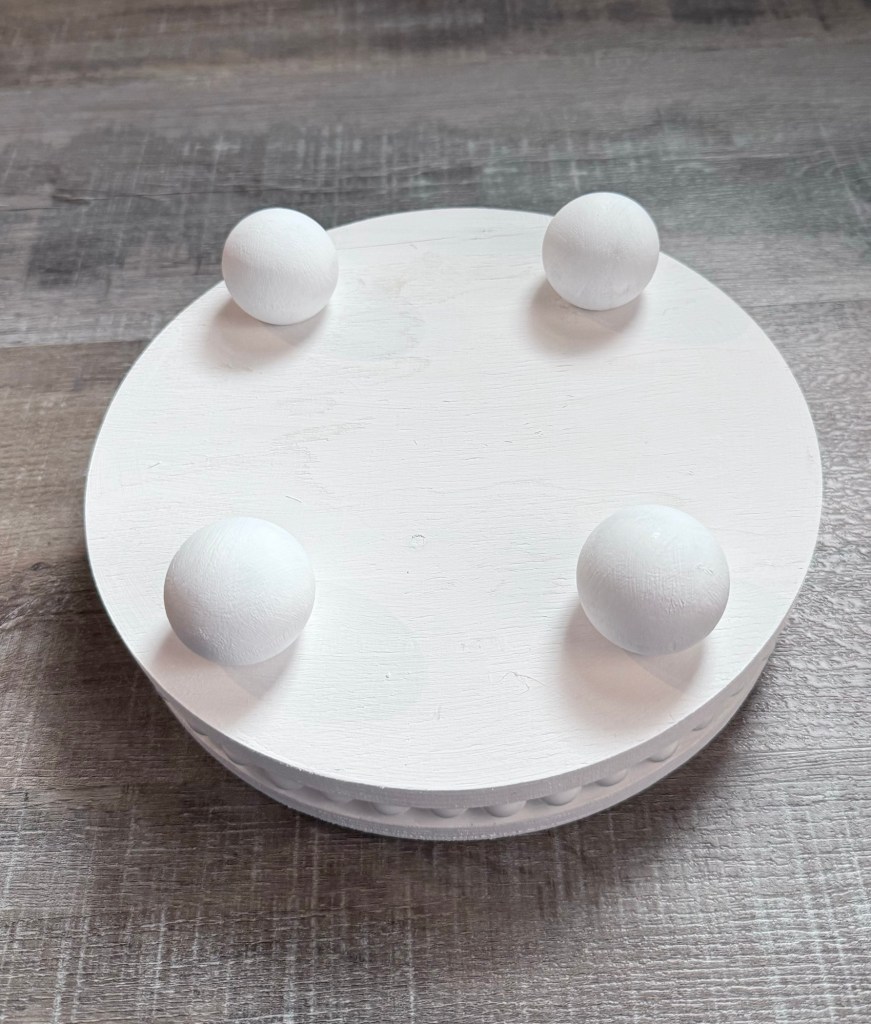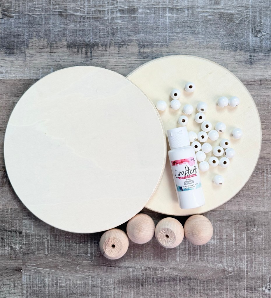 I already had some painted white wood beads (you’ll need enough to go around the wood circle), 1.5 inch unfinished ball knobs (you’ll need 4), and white chalk paint in my craft stash. My white beads are about half an inch in diameter, but you can use larger ones, too. Using pre-painted beads is so much easier than trying to paint them!
