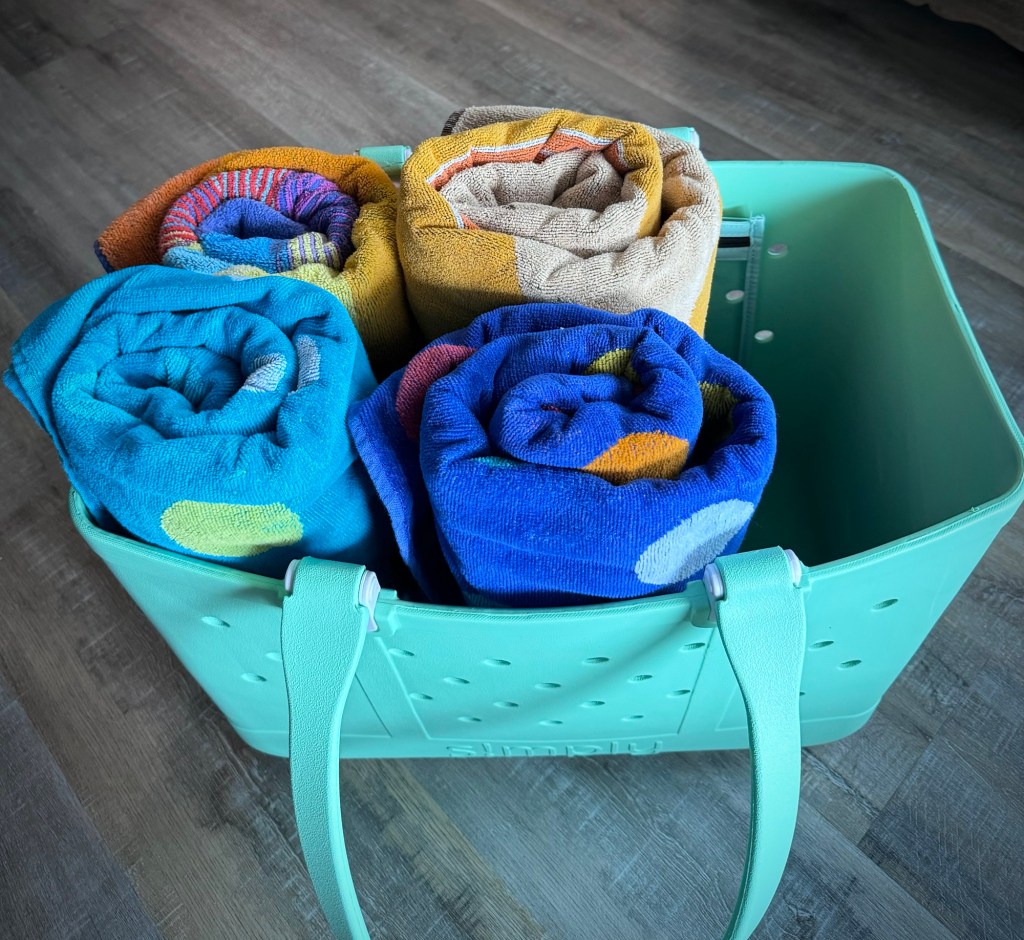 Here it is with 4 beach towels rolled up and tucked inside. There’s still room leftover for sunscreen and snacks. 😊