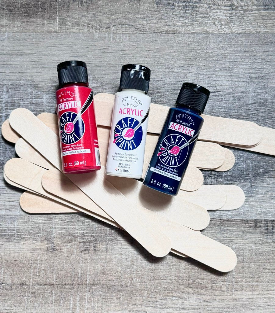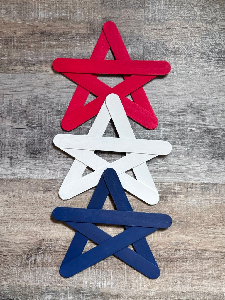 All you need are craft popsicle sticks, acrylic paints, and a little glue. I used jumbo popsicle sticks because I had them in my craft stash, but the regular size ones would work great, too – the stars would just be smaller. 😊
