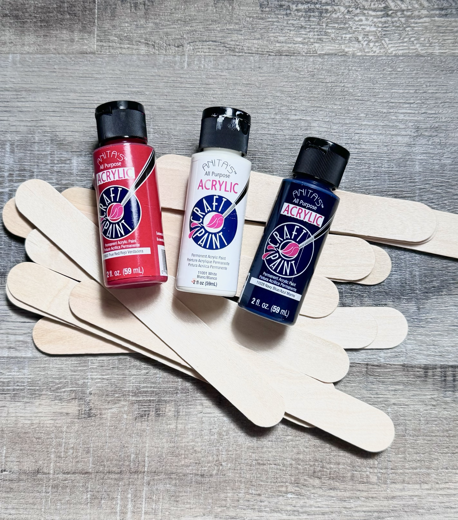 All you need are craft popsicle sticks, acrylic paints, and a little glue. I used jumbo popsicle sticks because I had them in my craft stash, but the regular size ones would work great, too – the stars would just be smaller. 😊