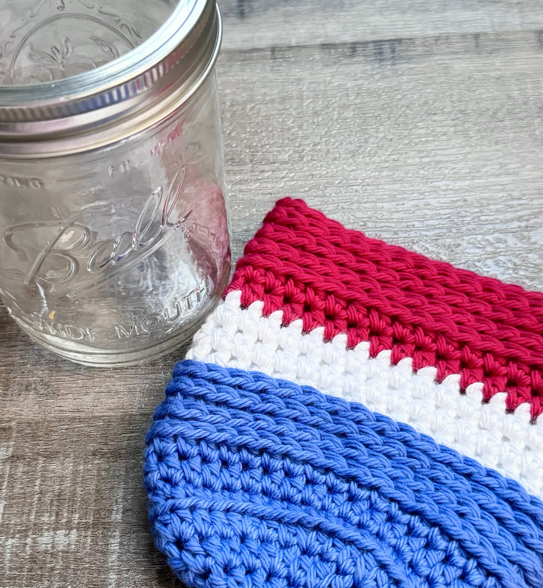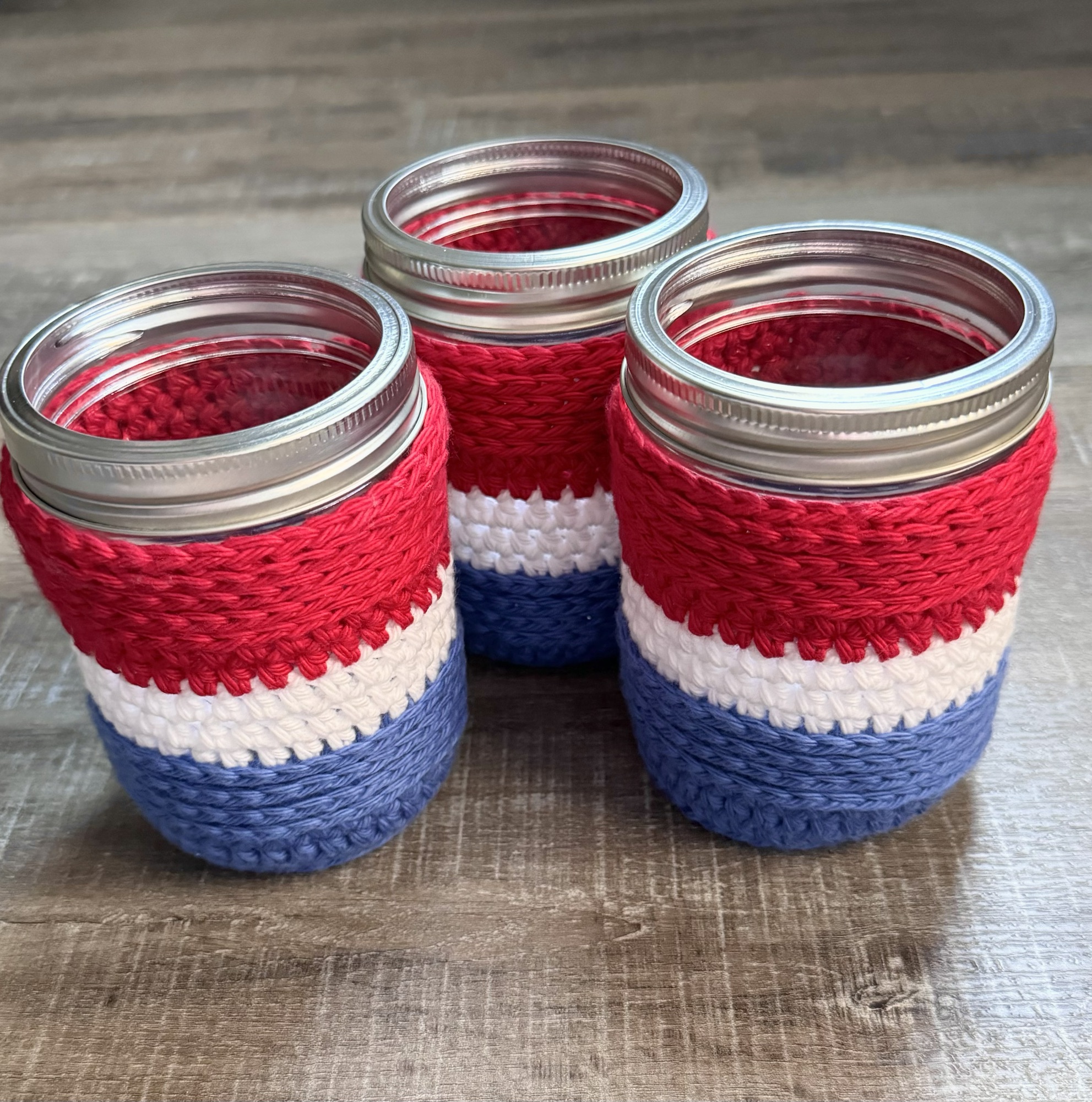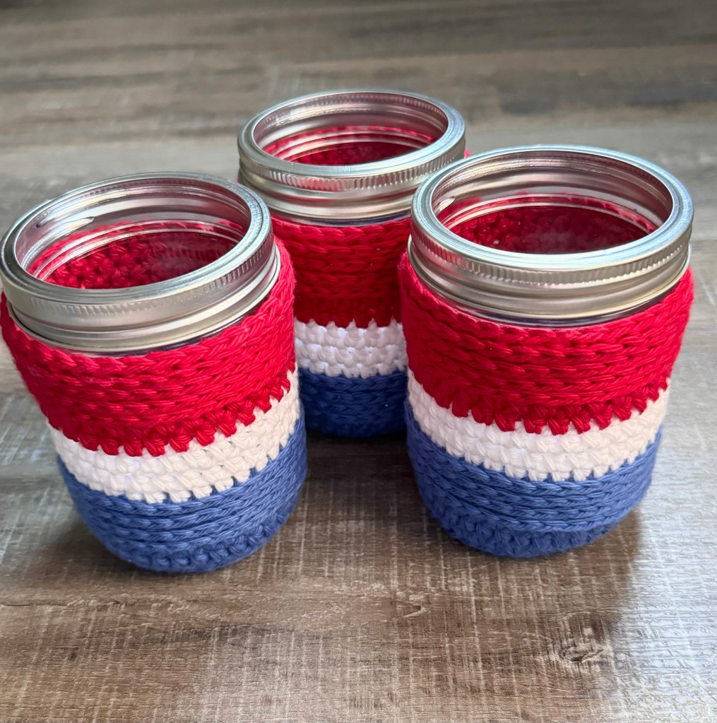 These Crochet Patriotic Mason Jar Covers are super easy and quick to make. They fit wide mouth pint size mason jars and have so many uses. They are great to hold utensils on the table, or fill them with fresh flowers for a great summer centerpiece. There are all kinds of fun patriotic picks at the craft stores right now if you don’t want to use fresh flowers. Use them to hold straws on the picnic table. You could even put citronella votive candles in them to help keep the bugs away. π