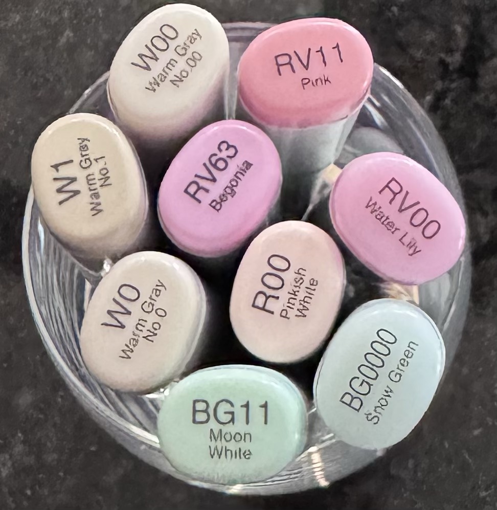 I stamped the mouse image with Memento Tuxedo Black ink on white card stock and colored her with Copic markers – the colors I used are in the photo below. Using the Scallops & Arched Nesting Dies from Unity Stamp Company, I die cut around the image. I stamped the sentiment with black ink on white card stock and die cut around it with the Scalloped & Stitched Sentiment Nesting Dies also from Unity. The sentiment is also part of the Tiny Tutu Soirée set.
