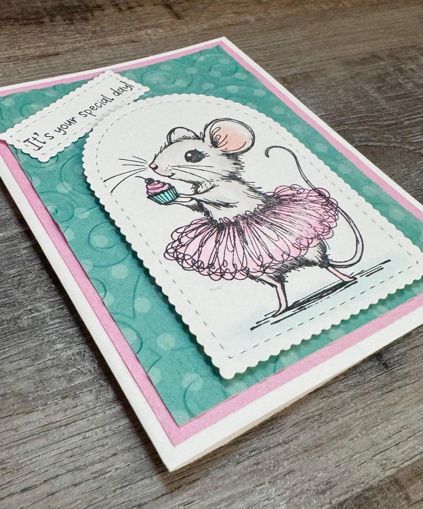 To make the card, I used a swirl embossing folder on a piece of patterned card stock, layered it to pink card stock, and attached it to a white card. I attached the mouse image to the card with foam tape and then attached the sentiment to the card.