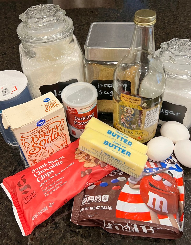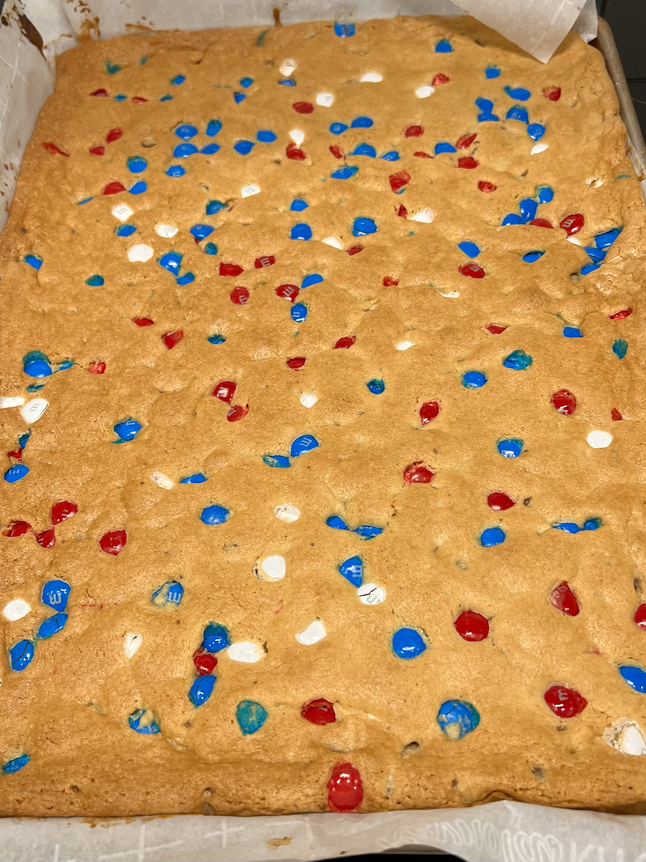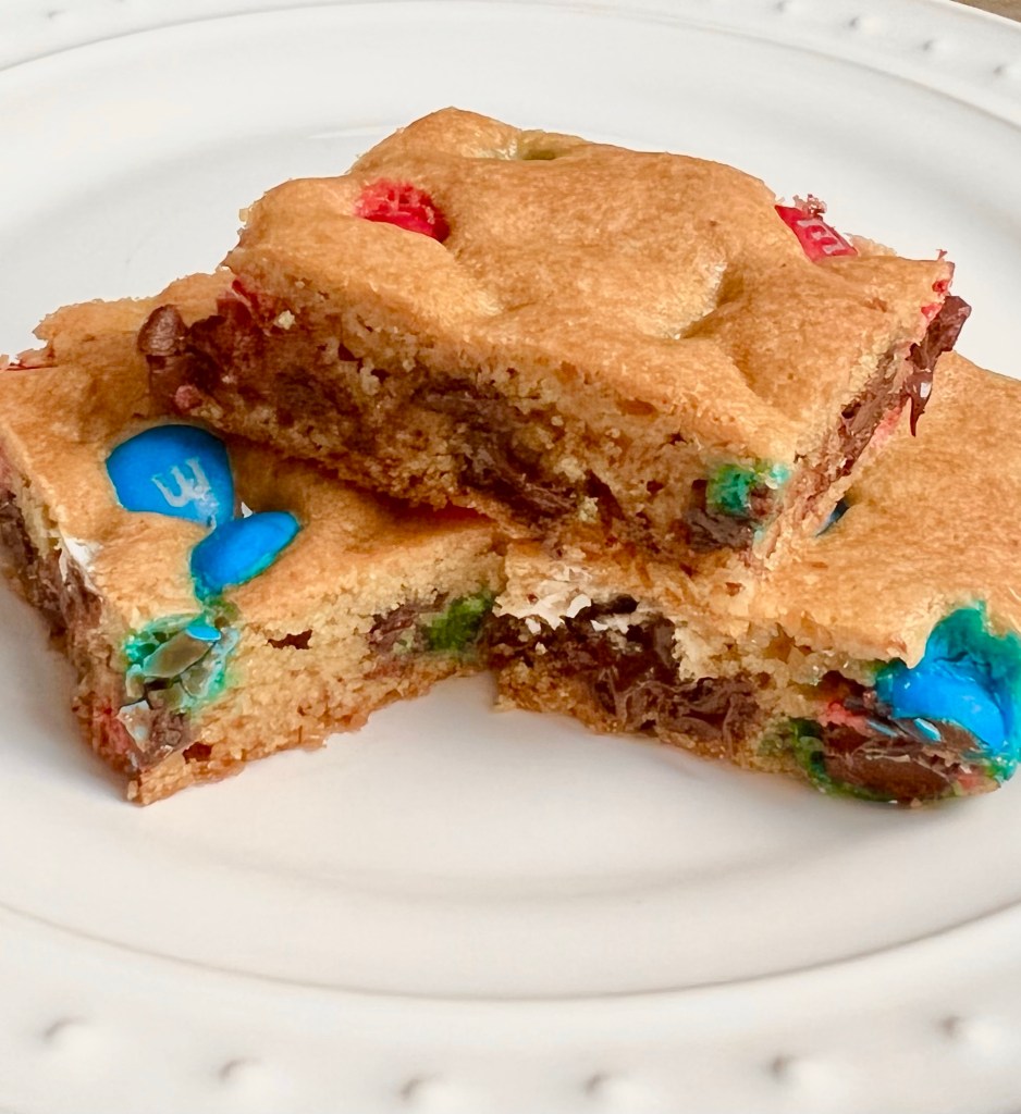 Cookie bars are the perfect Summer treat! They don’t take long to make and since you bake the whole batch of dough at once, your kitchen doesn’t get too hot. And using red, white, and blue M&Ms make them great for the 4th of July! 🇺🇸 😊