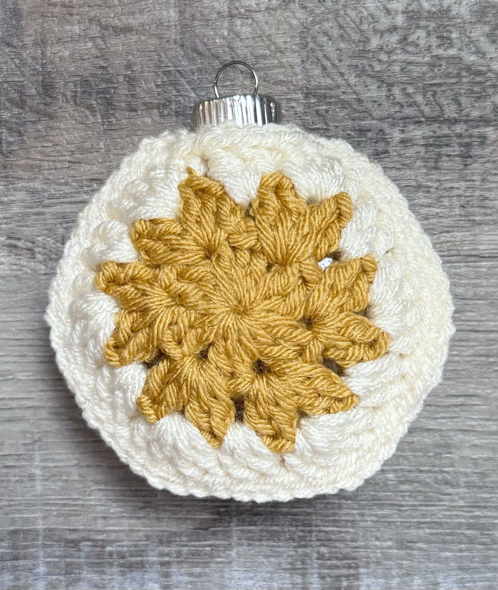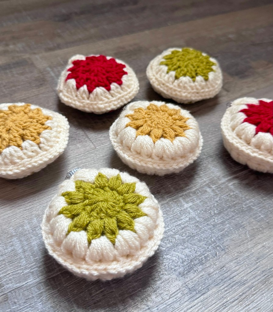 I had some small (2.625 inch) clear glass disc ornaments in my craft stash that I used to make my ornaments. I used Yarn Bee Soft & Sleek yarn in Mustard, Green Apple, Red, and Ivory with a 3.5mm crochet hook to stitch up my ornaments. Since my ornaments were smaller, I stopped after the 3rd round on each pattern. Crocheting all 4 rounds will fit larger size ornaments. You can find 3.15 inch plastic disc ornaments here and 4 inch plastic disc ornaments here.