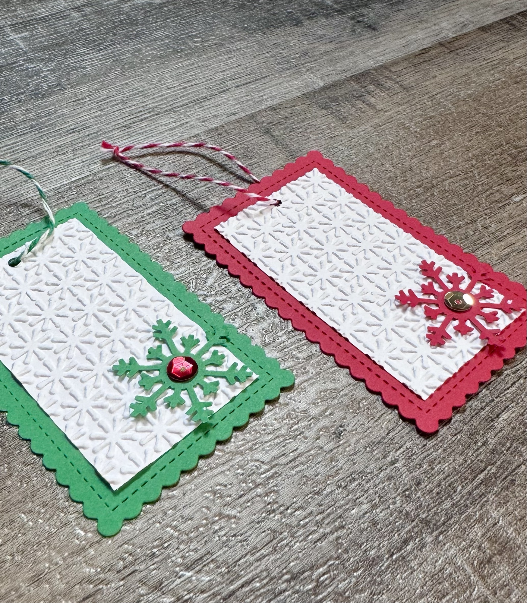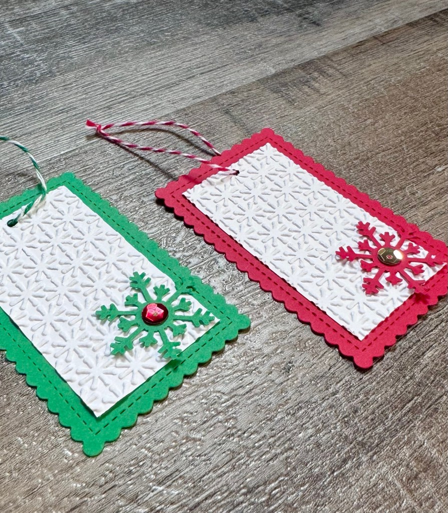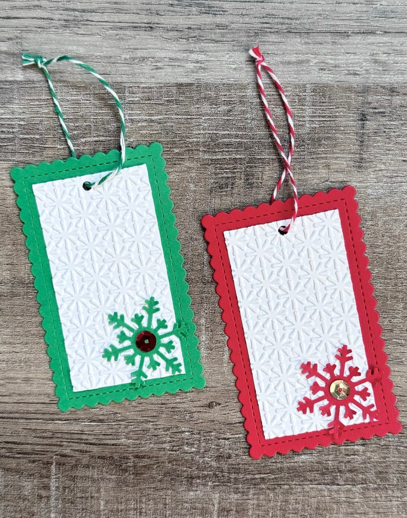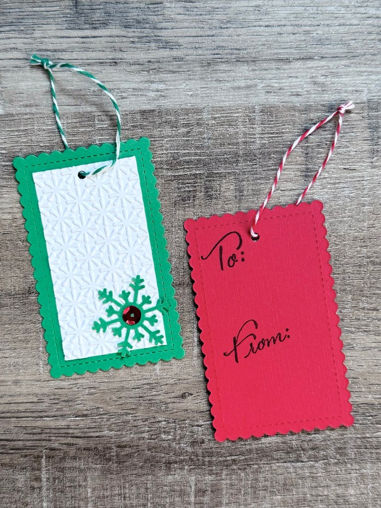 I used the Stitched Mini Scallop Rectangle STAX Die-namics from MFT Stamps to die cut red and green card stock. I trimmed white card stock to fit inside, embossed it with a snowflake embossing folder, and attached it to the tag. This embossing folder is no longer available – use your favorite folder or this is a nice option. Patterned paper is another option or you can just leave the card stock as is. 🙂