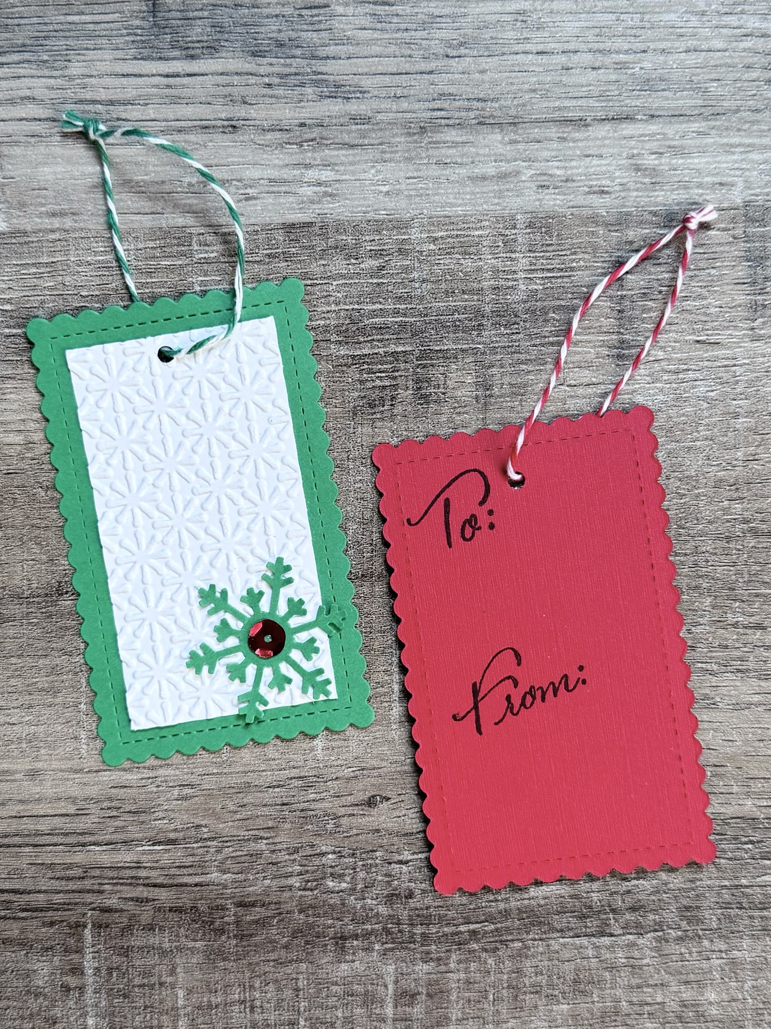 I punched snowflakes (this is a similar punch) from red or green card stock and attached them to the tags. Then I added a red sequin or a gold sequin to the center of the snowflakes. Using my Crop-A-Dile, I punched a small hole in the top of the tags and tied on red/white or green/white bakers twine. On the back of the tags, I stamped “To” and “From” (this is a similar set) with black ink.