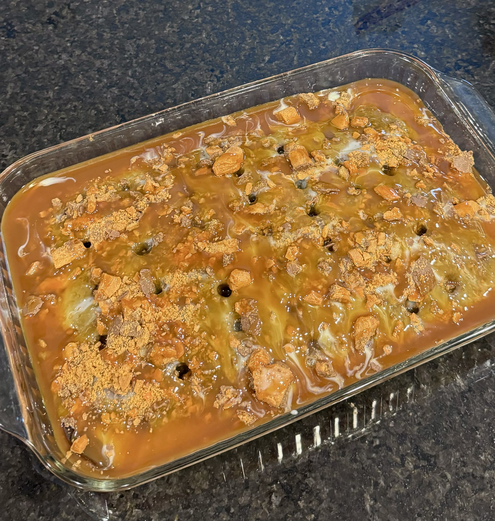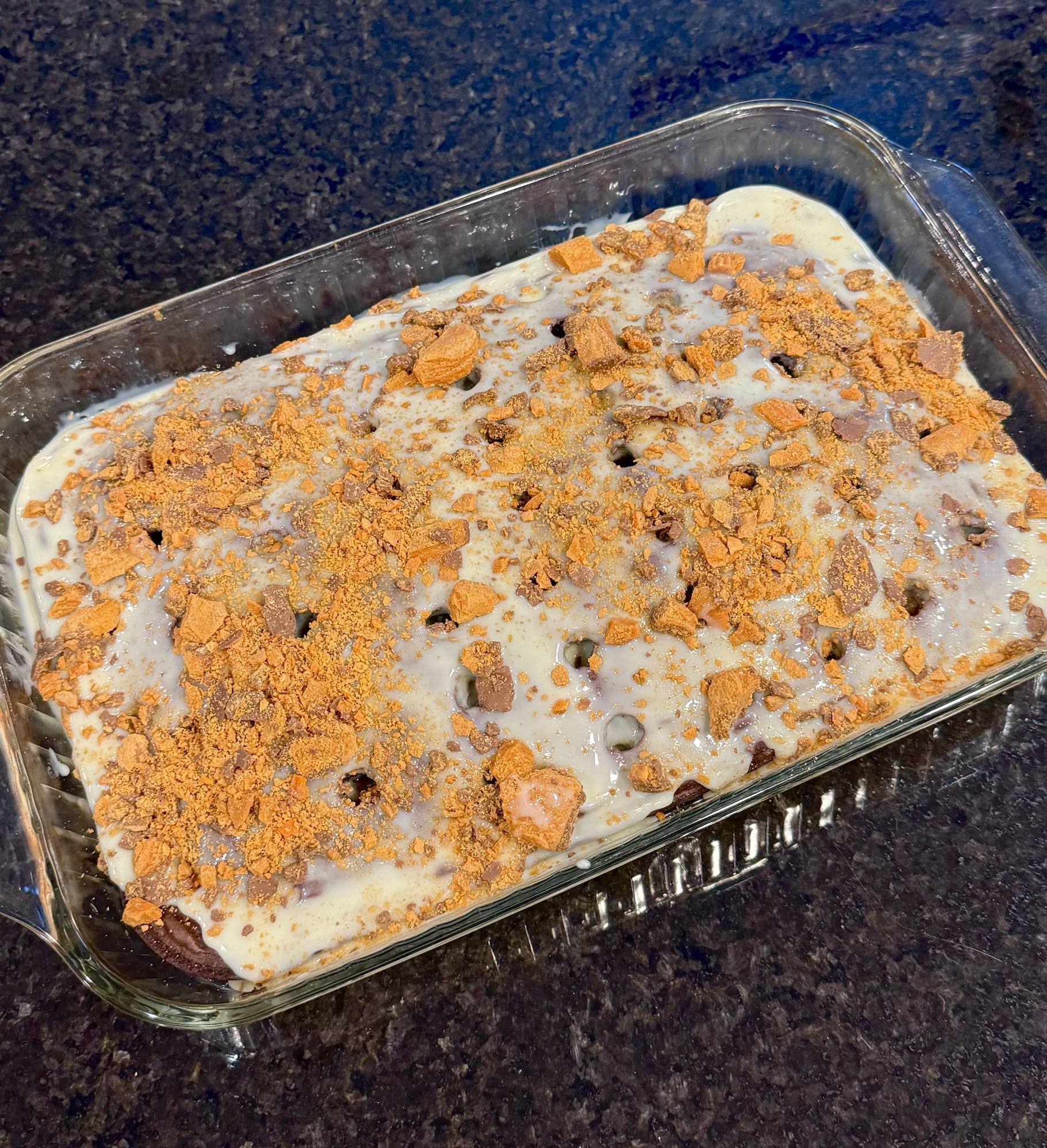 I think this cake would be amazing with chopped Snickers bars in place of the Butterfingers, too! 😋