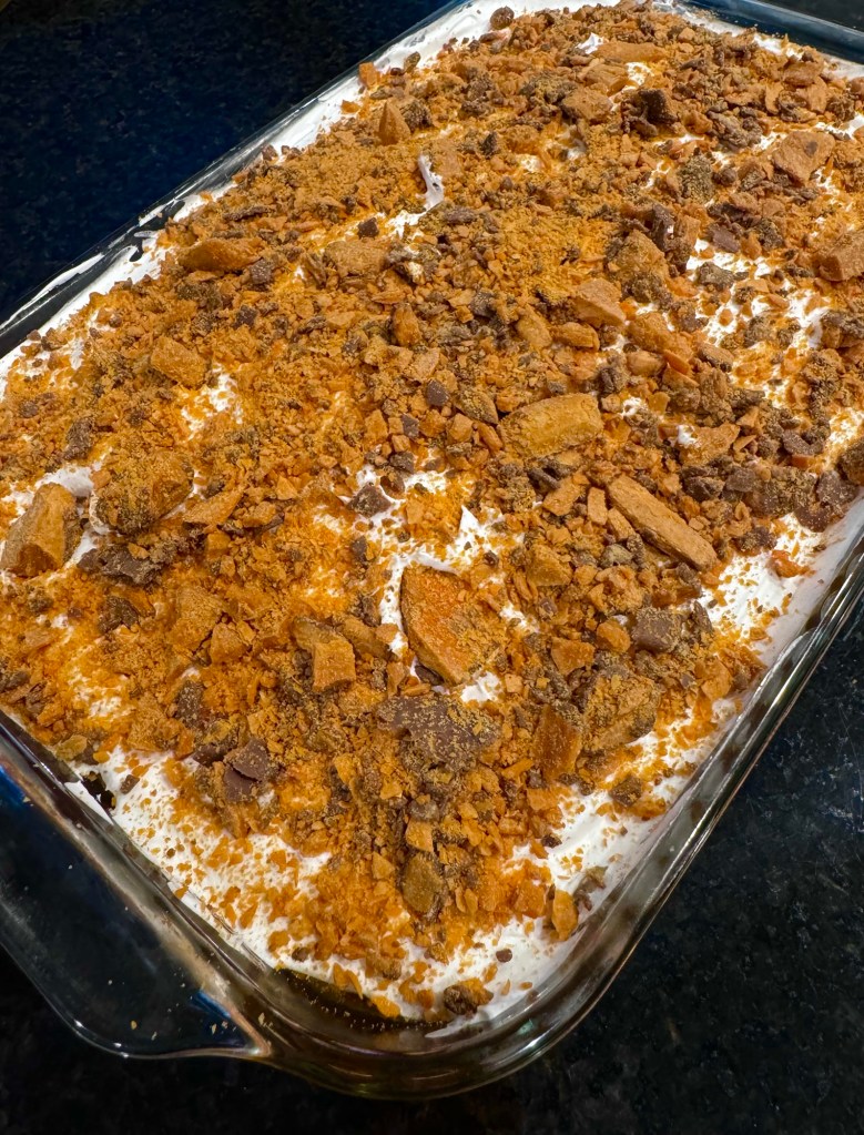 We were invited to a potluck recently and I signed up to bring a dessert but wasn’t sure what I was going to make. I had heard that this Butterfinger Cake recipe from Passionate Penny Pincher was really good so I decided to try it.