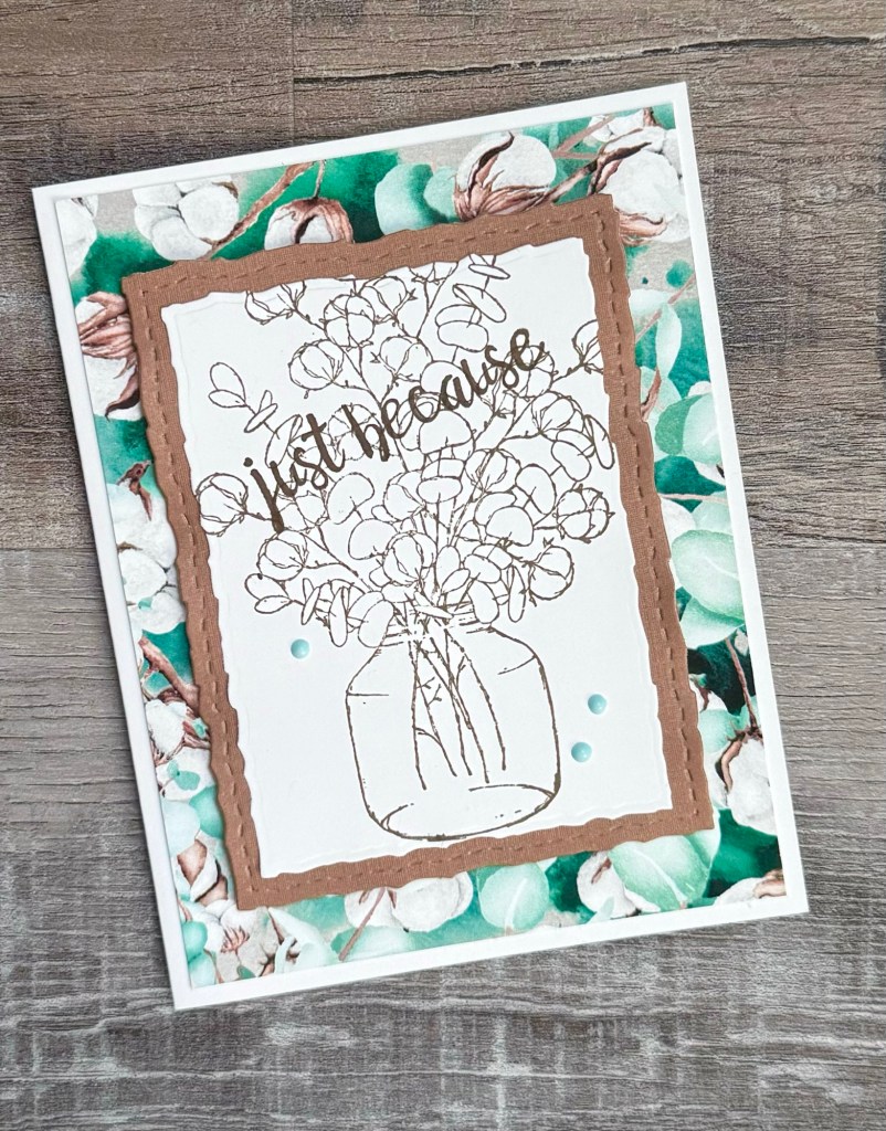 I stamped the image with Memento Rich Cocoa ink on white card stock. Using the Deckle & Stitches Nesting Die Set from Unity, I die cut around the image. The top and edges of the image are cut off – I just made sure that the die was lined up so the image was cut just below the bottom of the vase.