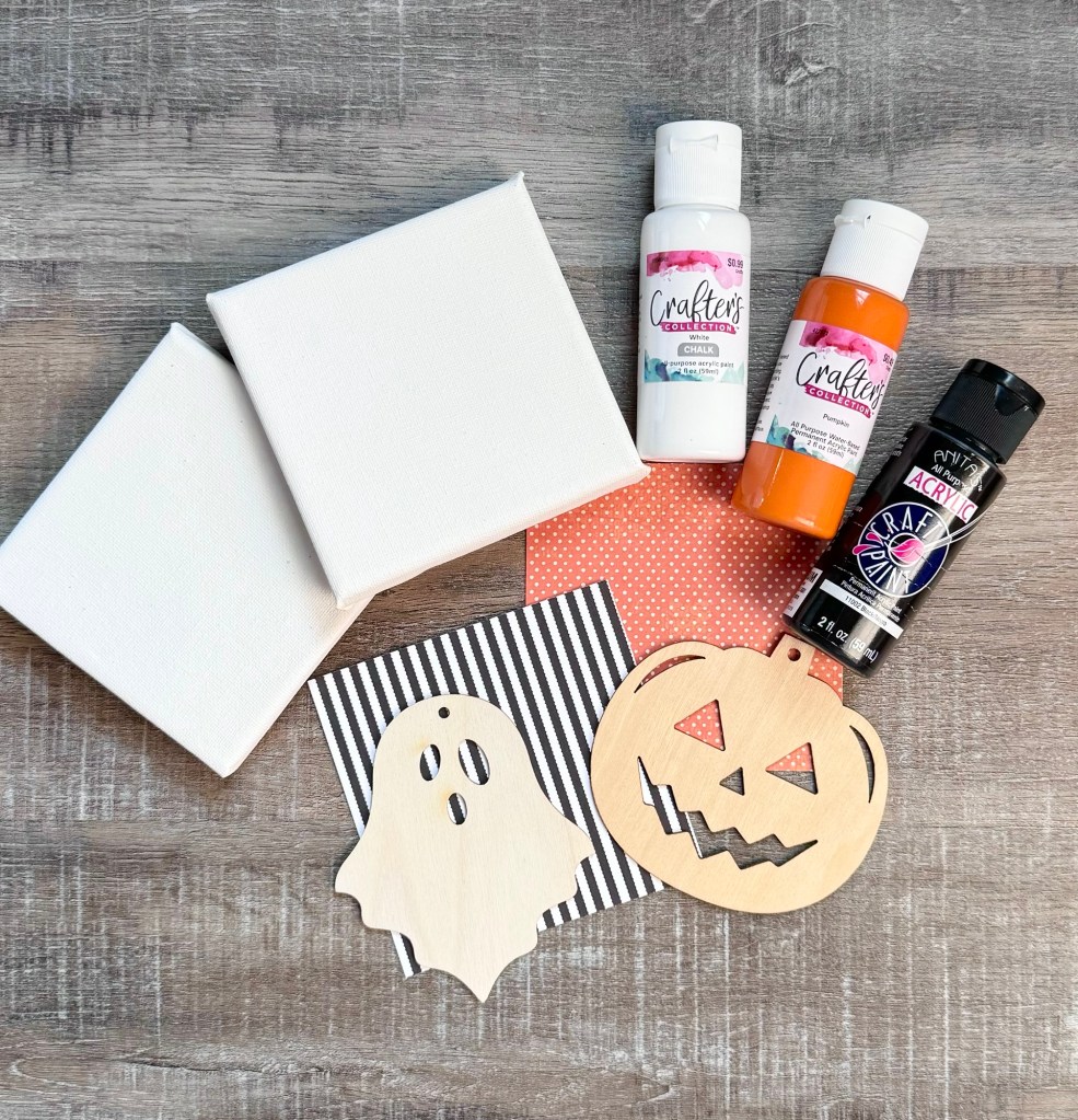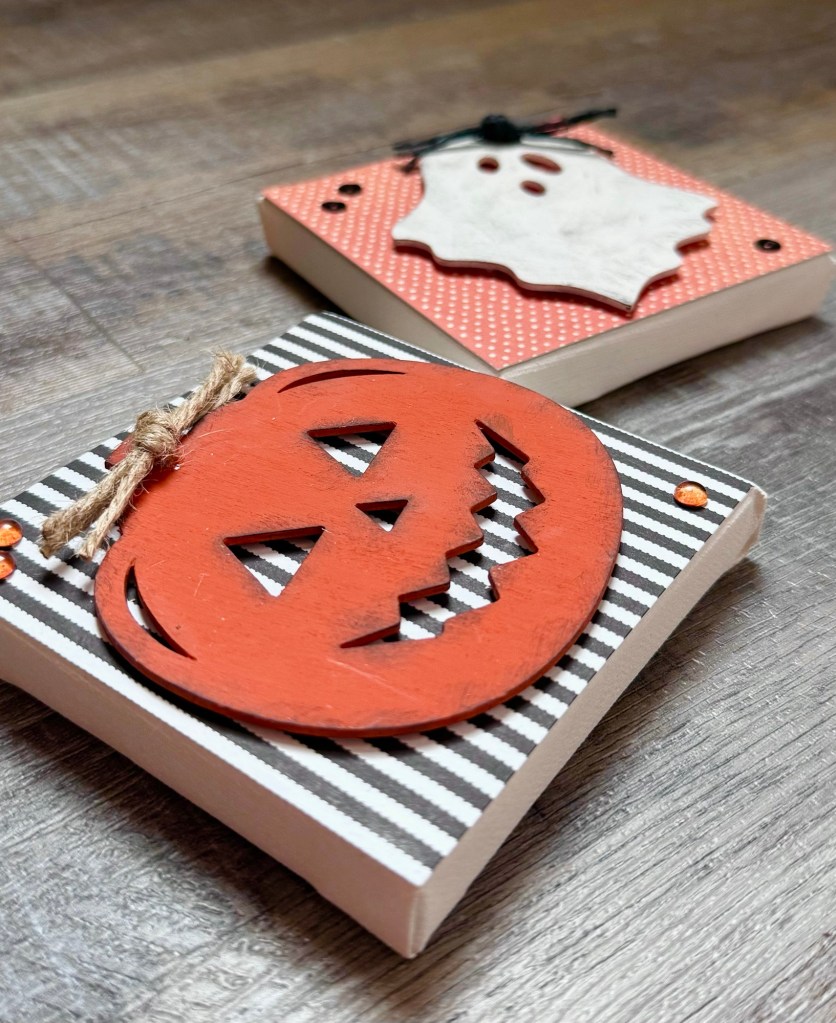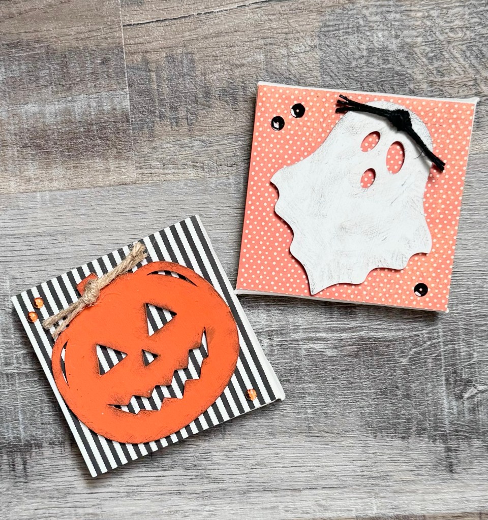 These little canvases measure about 4 by 4 inches and are the perfect size for the unfinished wood Halloween ornaments you can find at Dollar Tree. Add a little paint and some scrapbook paper and you can create some cute shelf sitters. ππ»