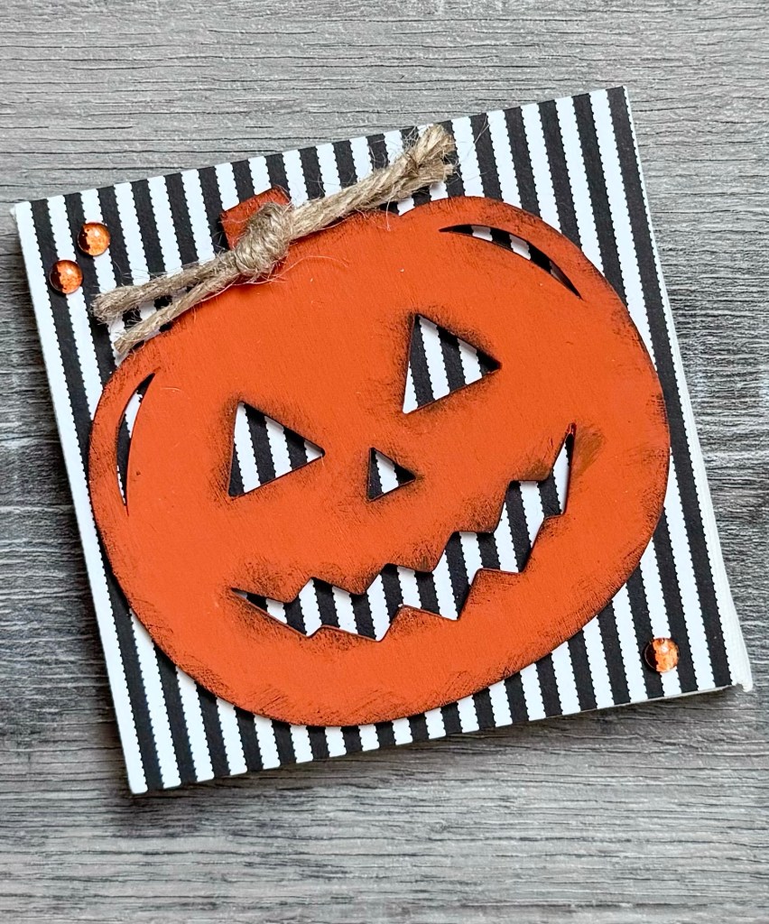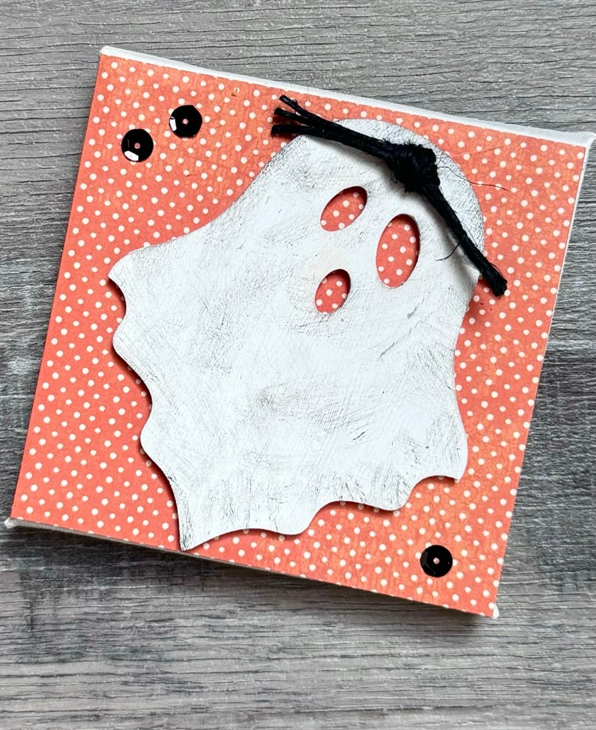 I painted the Jack-o-lantern and ghost with 2 coats of acrylic paint. To add a little depth, I dry brushed both of them with black acrylic paint.