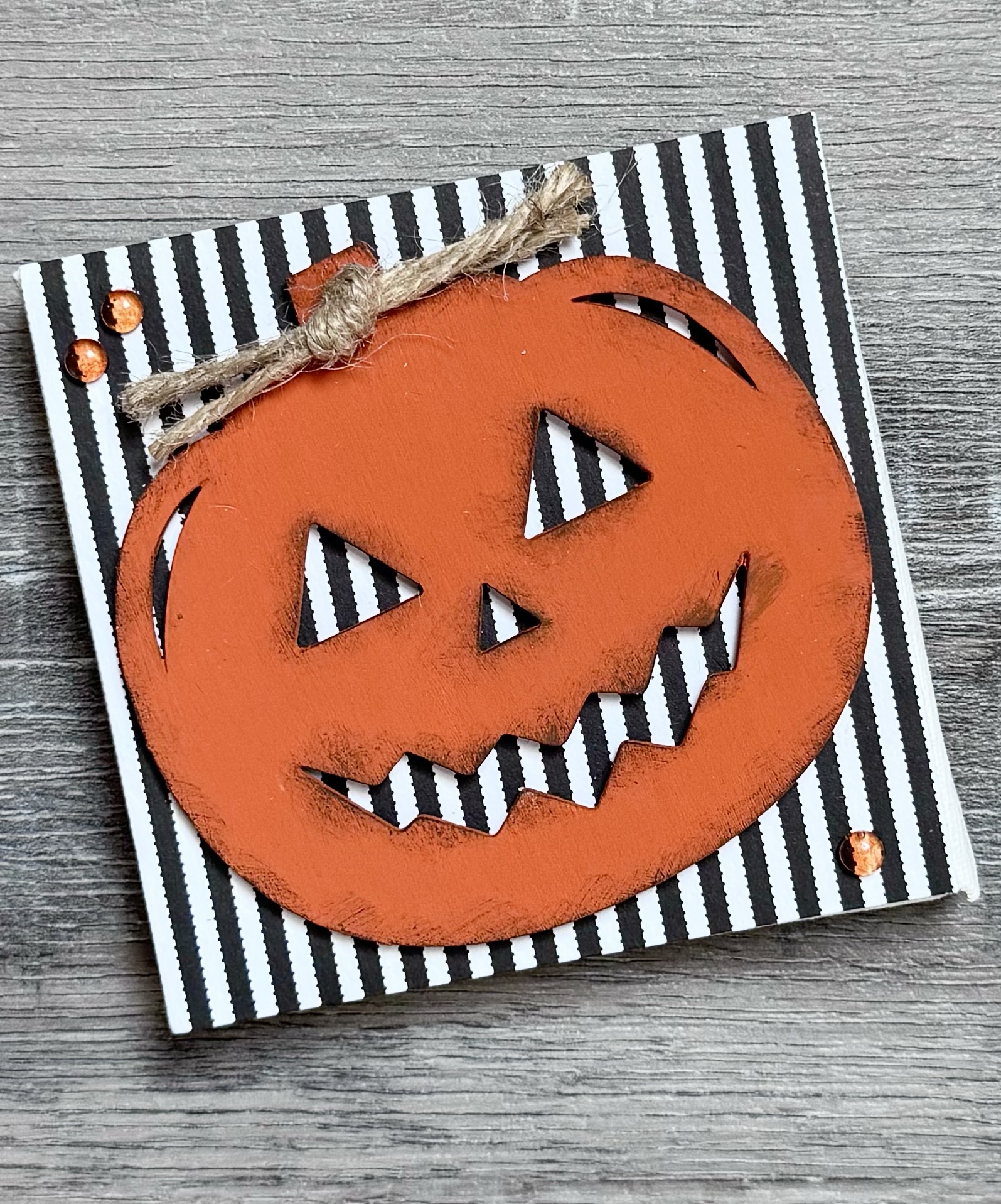 I painted the Jack-o-lantern and ghost with 2 coats of acrylic paint. To add a little depth, I dry brushed both of them with black acrylic paint.