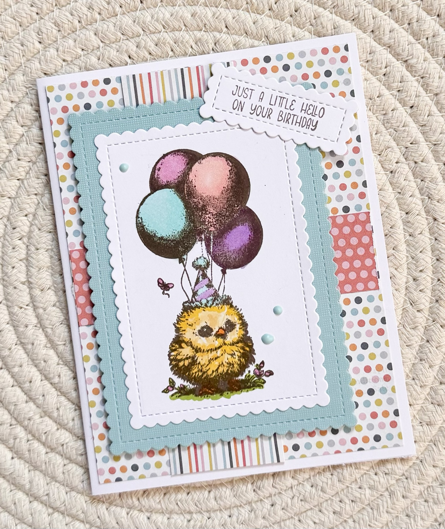 Look at this adorable little birthday chick! The name of the stamp set is Bitty Birthday Bash and he’s from Unity Stamp Company. He makes the sweetest birthday card. 🙂