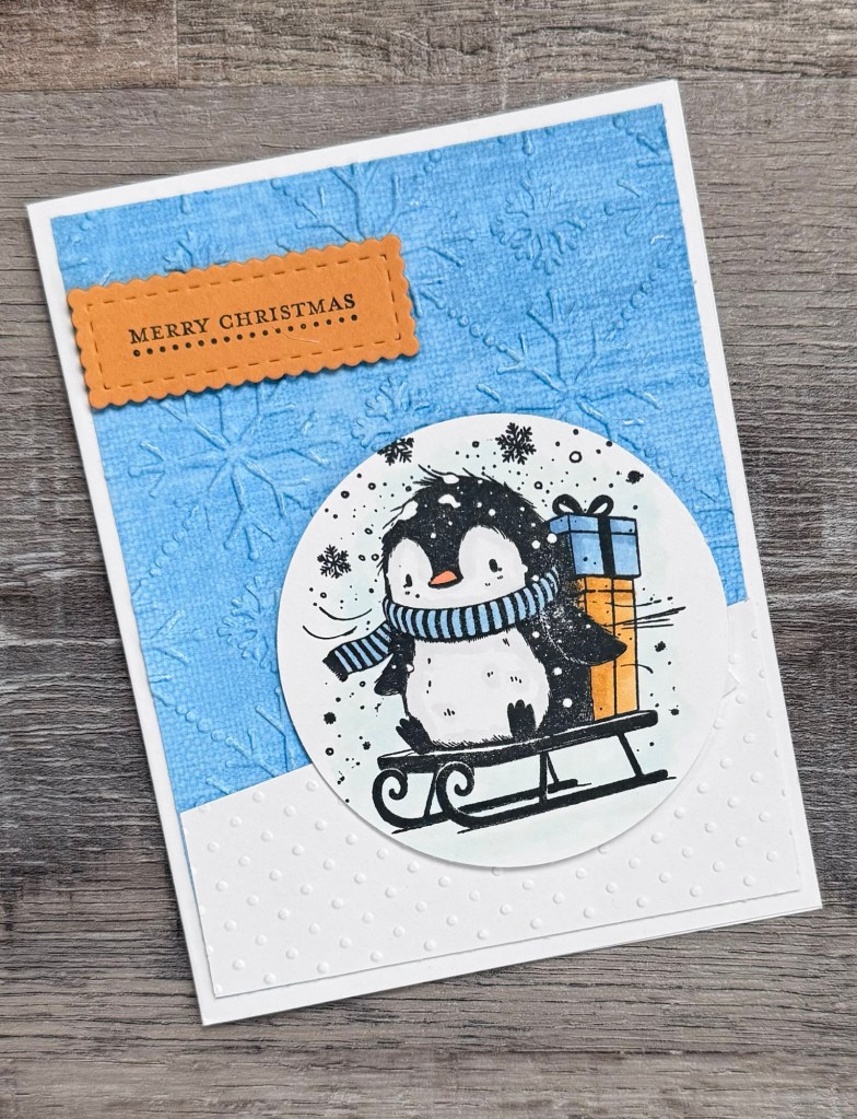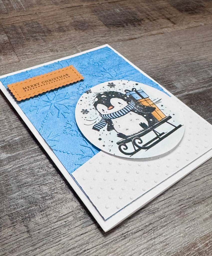I embossed a piece of lightly patterned blue paper with a snowflake embossing folder (this is similar) and attached it to a white card. I added a strip of white card stock cut at an angle and embossed with a dot embossing folder. The penguin and the sentiment are attached to the card with foam tape.