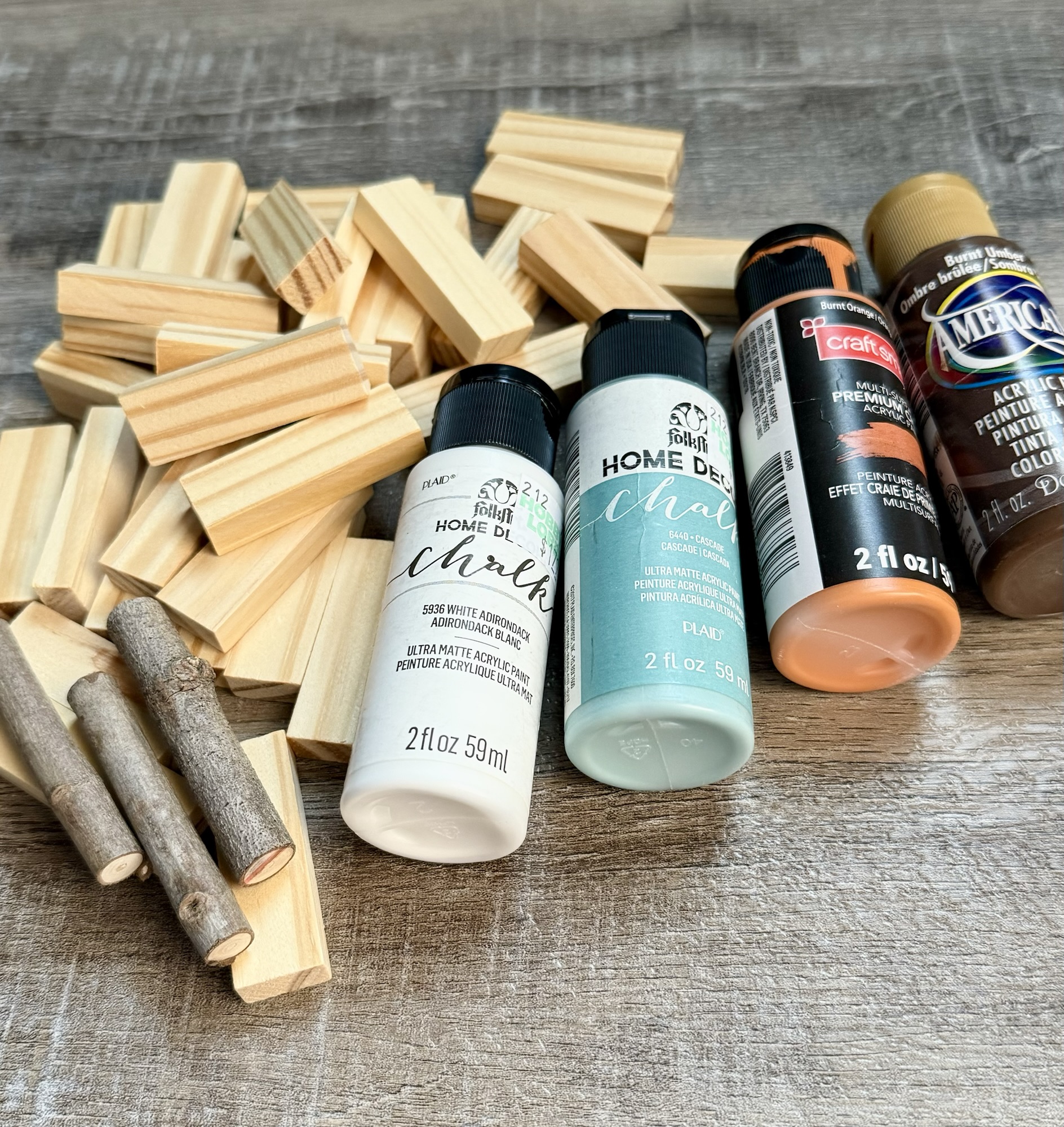 Turning these little blocks into tiny pumpkins is one of my favorite ideas. A little paint, hot glue, and some sticks for a stem are all you need to make pumpkins like mine.