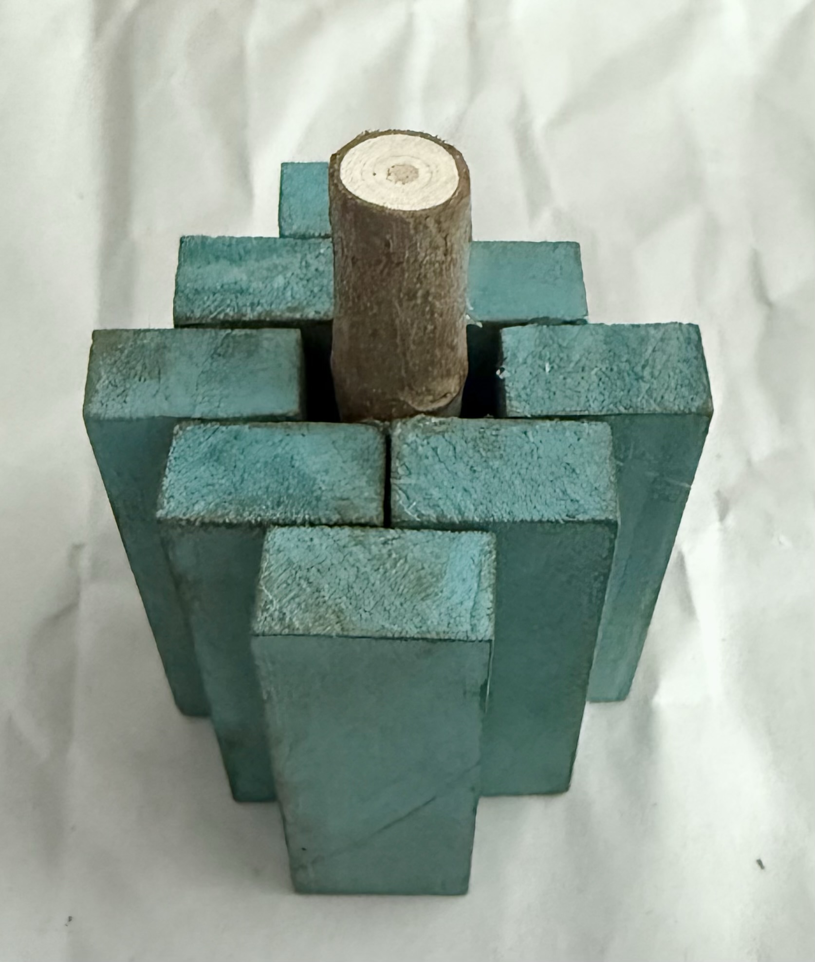 I hot glued the blocks together like in the pictures below, leaving a space to add my stick for the stem. I added hot glue to the stick and slipped it into the space. To finish my pumpkins, I tied natural twine in a knot around the stem.