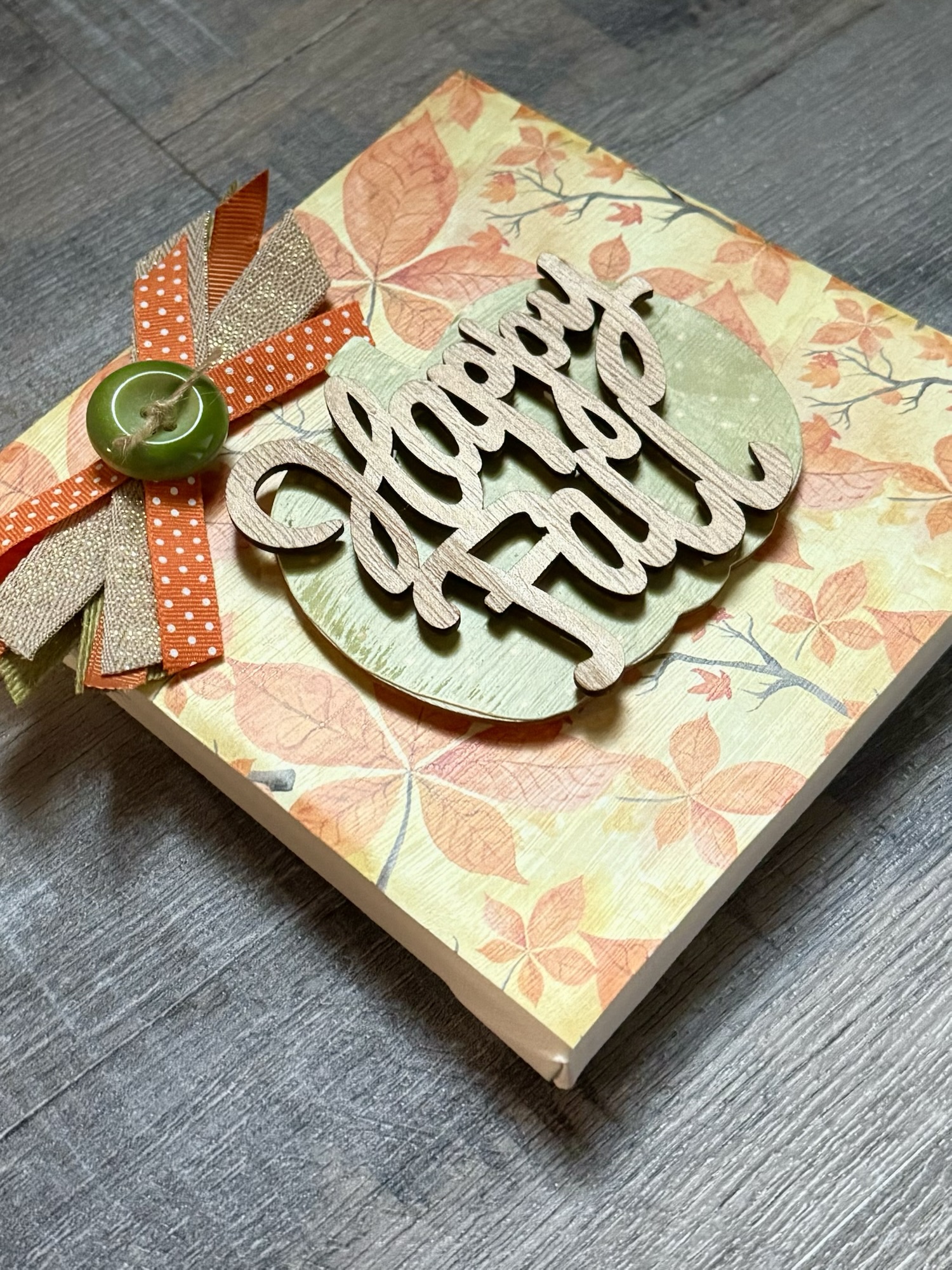 I used a 6 by 6 inch stretched canvas, patterned scrapbook paper, a small wood pumpkin cutout, a “Happy Fall” wood cutout, various ribbons and a button for the bow, Mod Podge to adhere the paper, and foam tape.