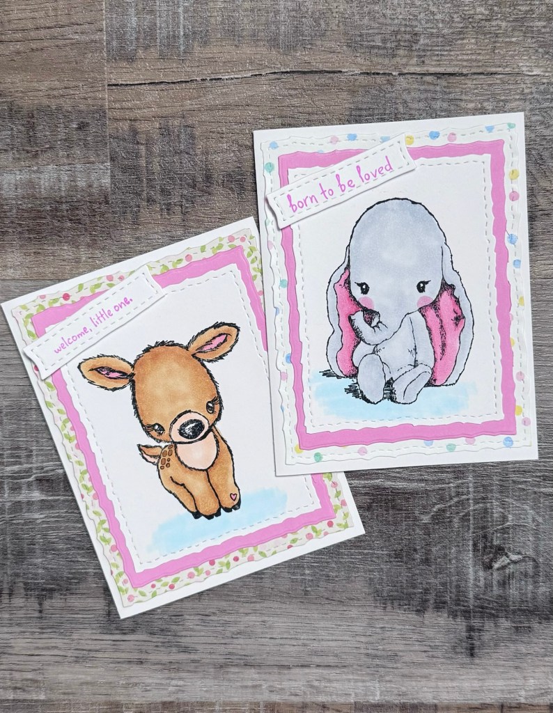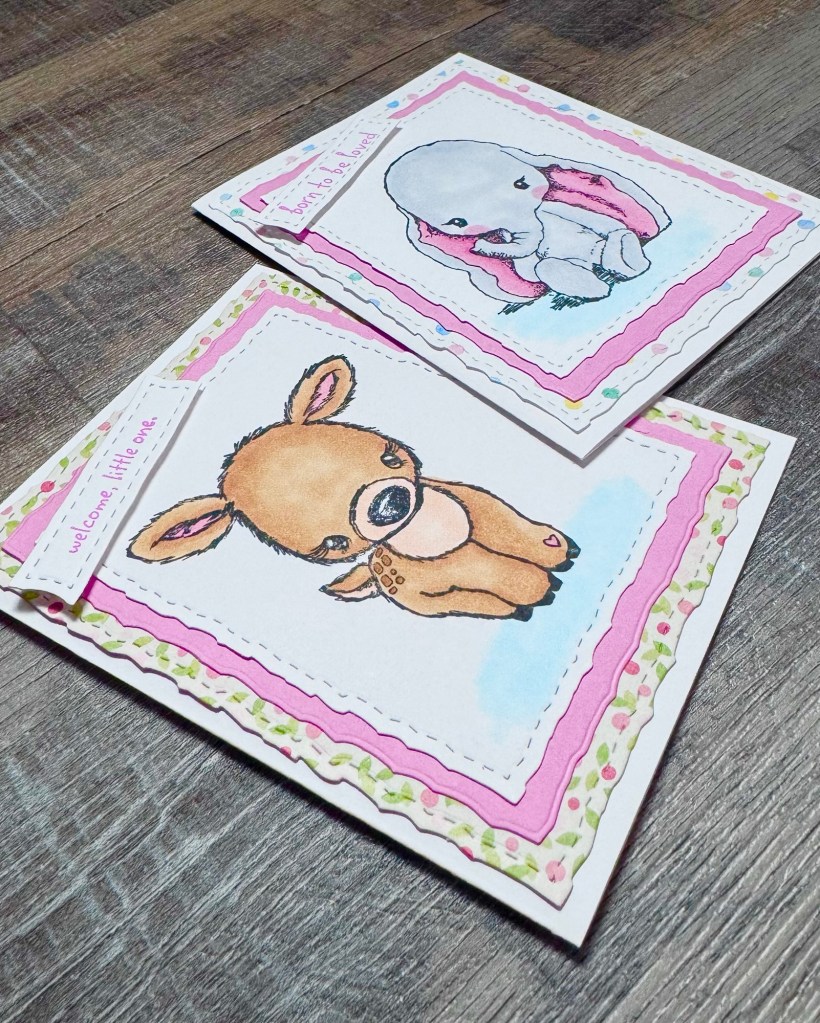 Some of them make the best baby cards. I used the Cuddlebug Fawn and the Cuddlebug Elephant to make these 2 cards.