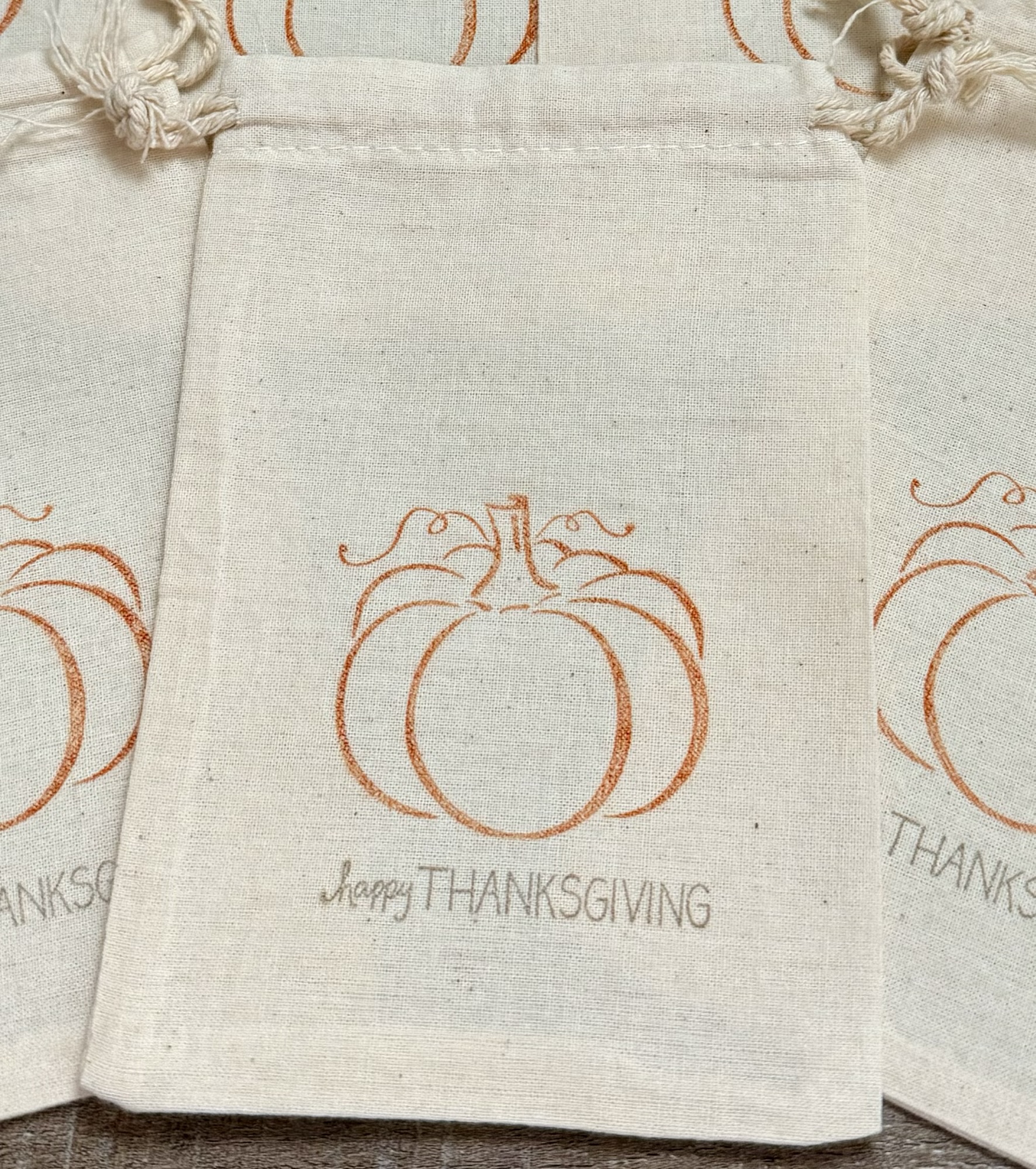 These muslin bags from Amazon measure about 4 by 6 inches and are the perfect size for putting together little Fall treat bags. Think Halloween treats or Thanksgiving favors at each seat at the dinner table or just little gifts for your friends. They’re super quick and easy to stamp so you can even make them up at the last minute. 😉