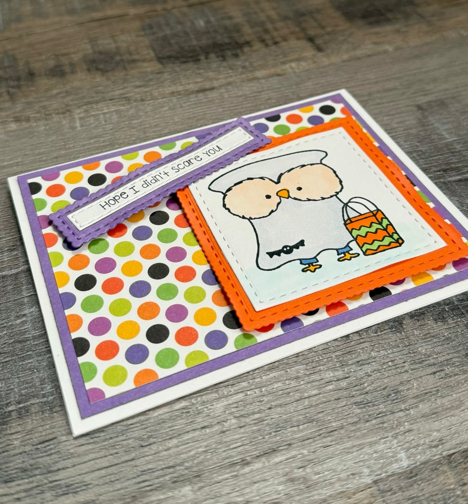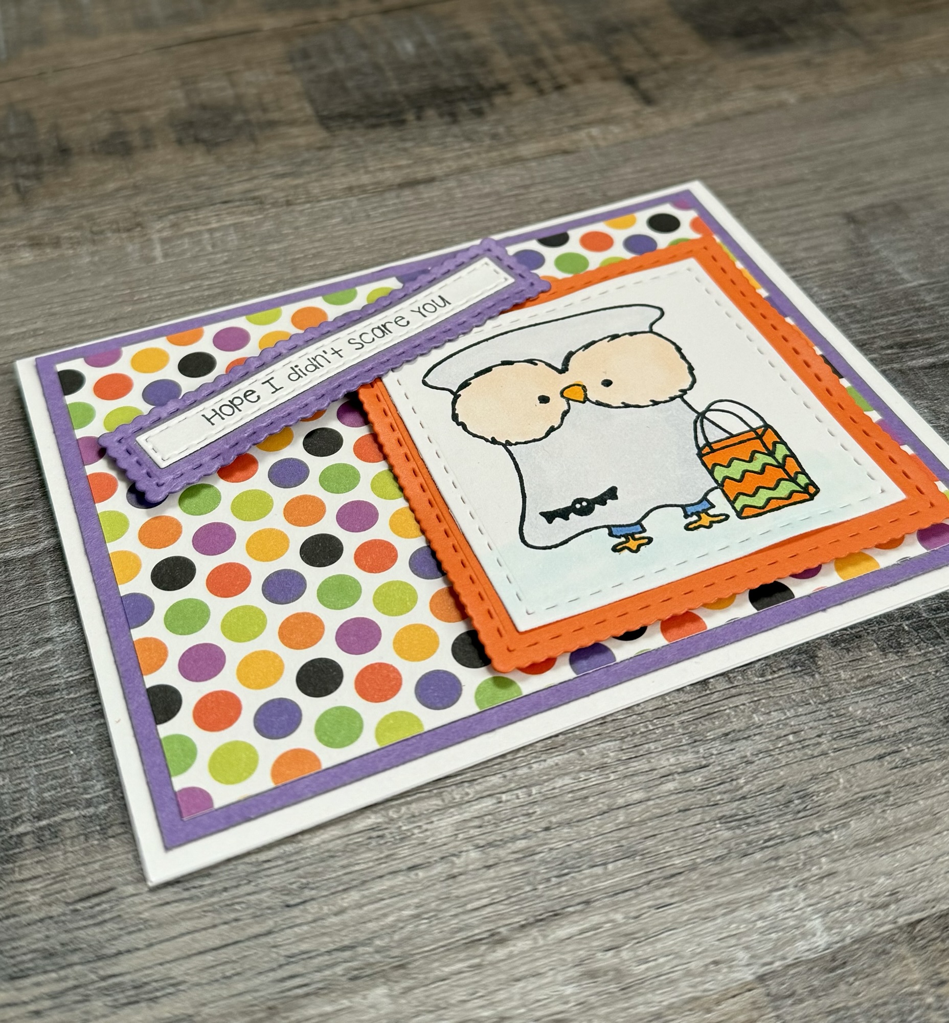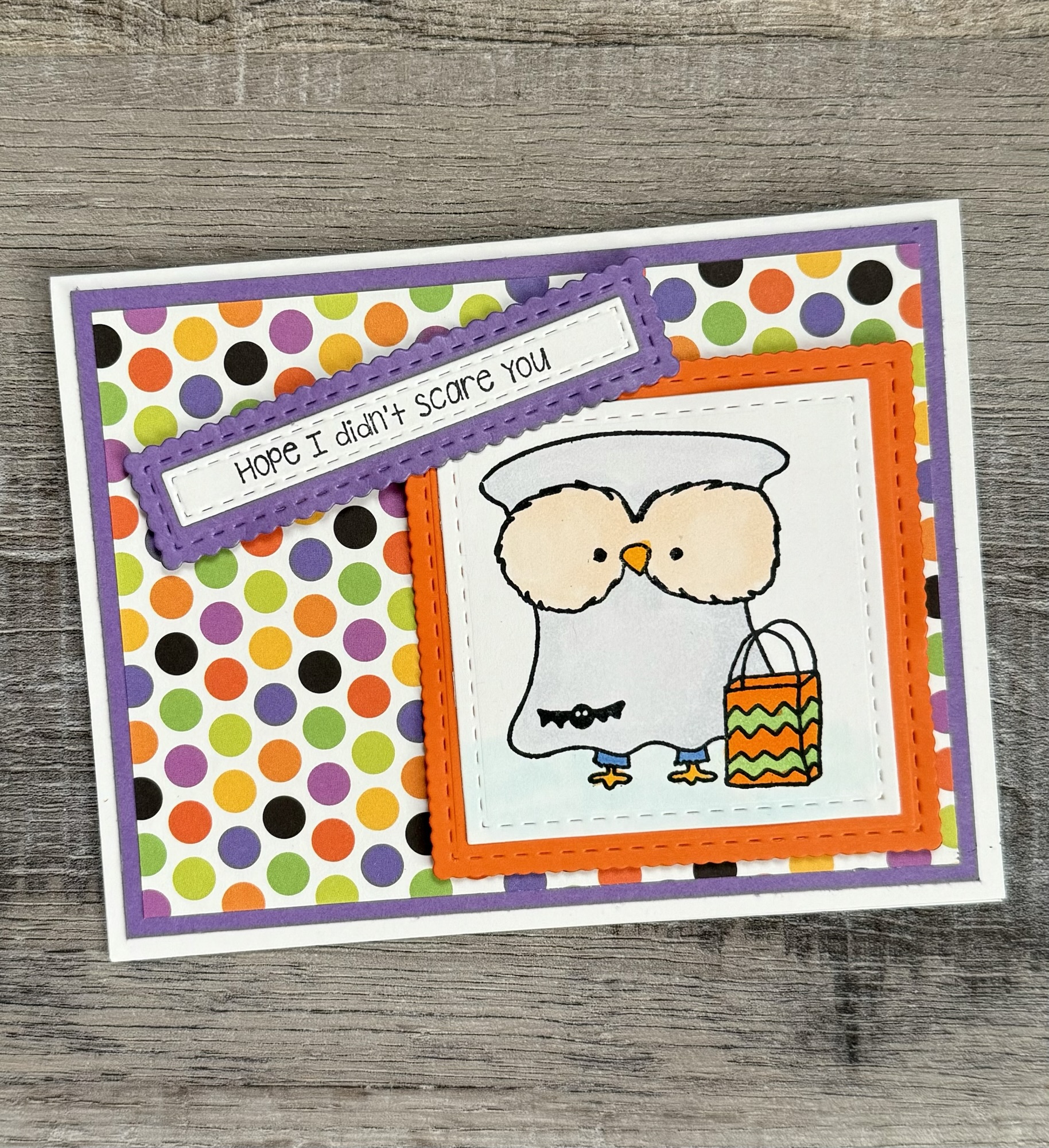 To make the card, I layered patterned paper to purple card stock and attached it to a white card. The little owl ghost and the sentiment are attached to the card with foam tape.