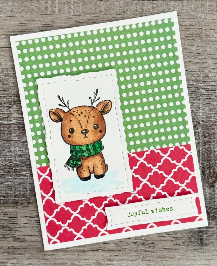 This month’s card layout is from the Build Your Stash Holiday Cardmakers Sketch Challenge 51. The cute little reindeer stamp and sentiment stamps are from the Just for You Dear stamp set from Unity Stamp Company.