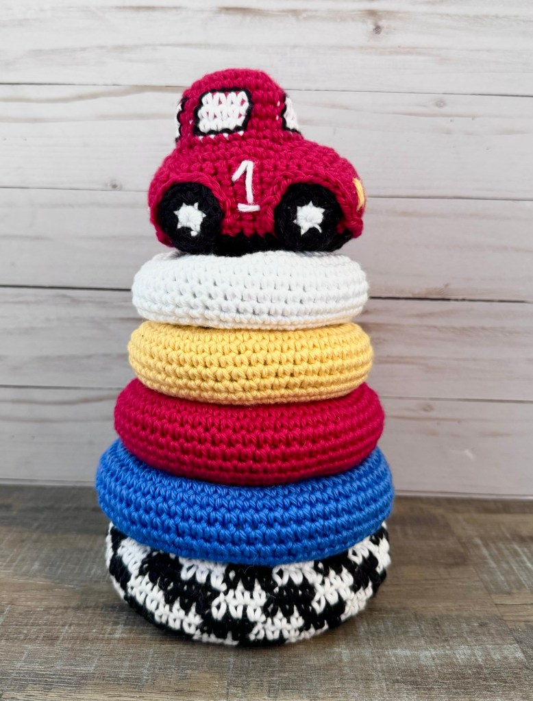 A special little boy turned one this month! 💙 I found this adorable Crochet RaceCar Stacking Ring Toy pattern from Those Yarn Girls and knew it would be the perfect gift for his first birthday. 🎁 It is a paid pattern, but I promise it is worth it!😊