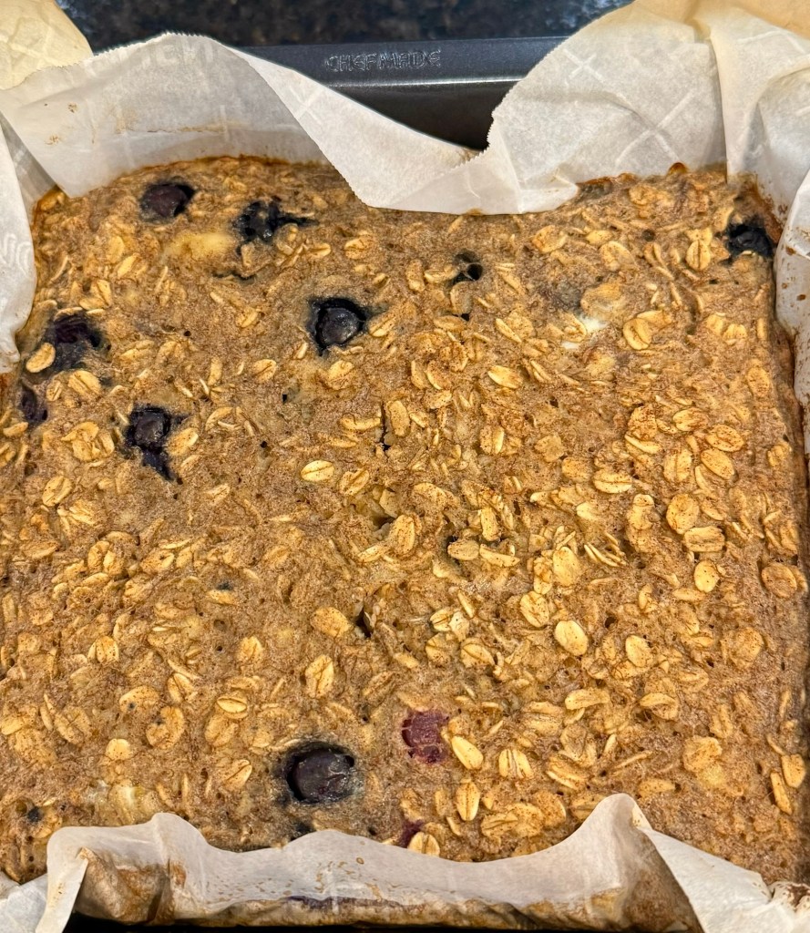 The bars only take 9 ingredients and they mix up in just a few minutes. I used frozen blueberries in my breakfast bars because I already had them in my freezer. The recipe calls for ground flaxseed, but I didn’t have any so I left it out. π