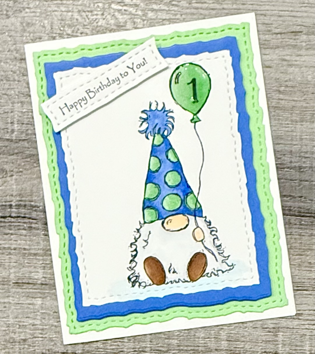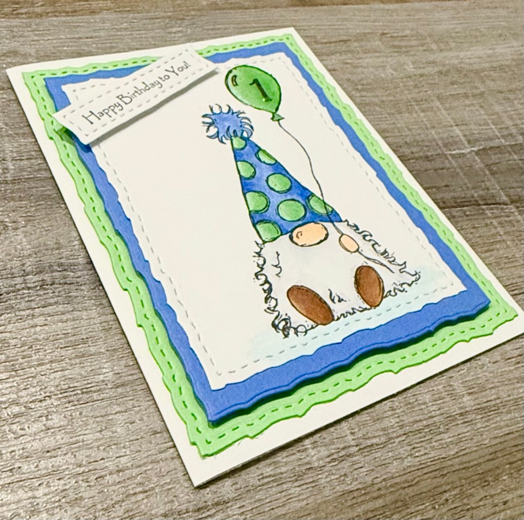 I stamped the gnome with Memento Tuxedo Black ink on white card stock and colored him with Copic markers. I stamped the number “1” in the balloon and added Diamond Glaze to the balloon to add a bit of shine. After it was dry, I die cut around the image using these Deckle & Stitches Nesting Dies and layered it to blue card stock die cut with the same set.