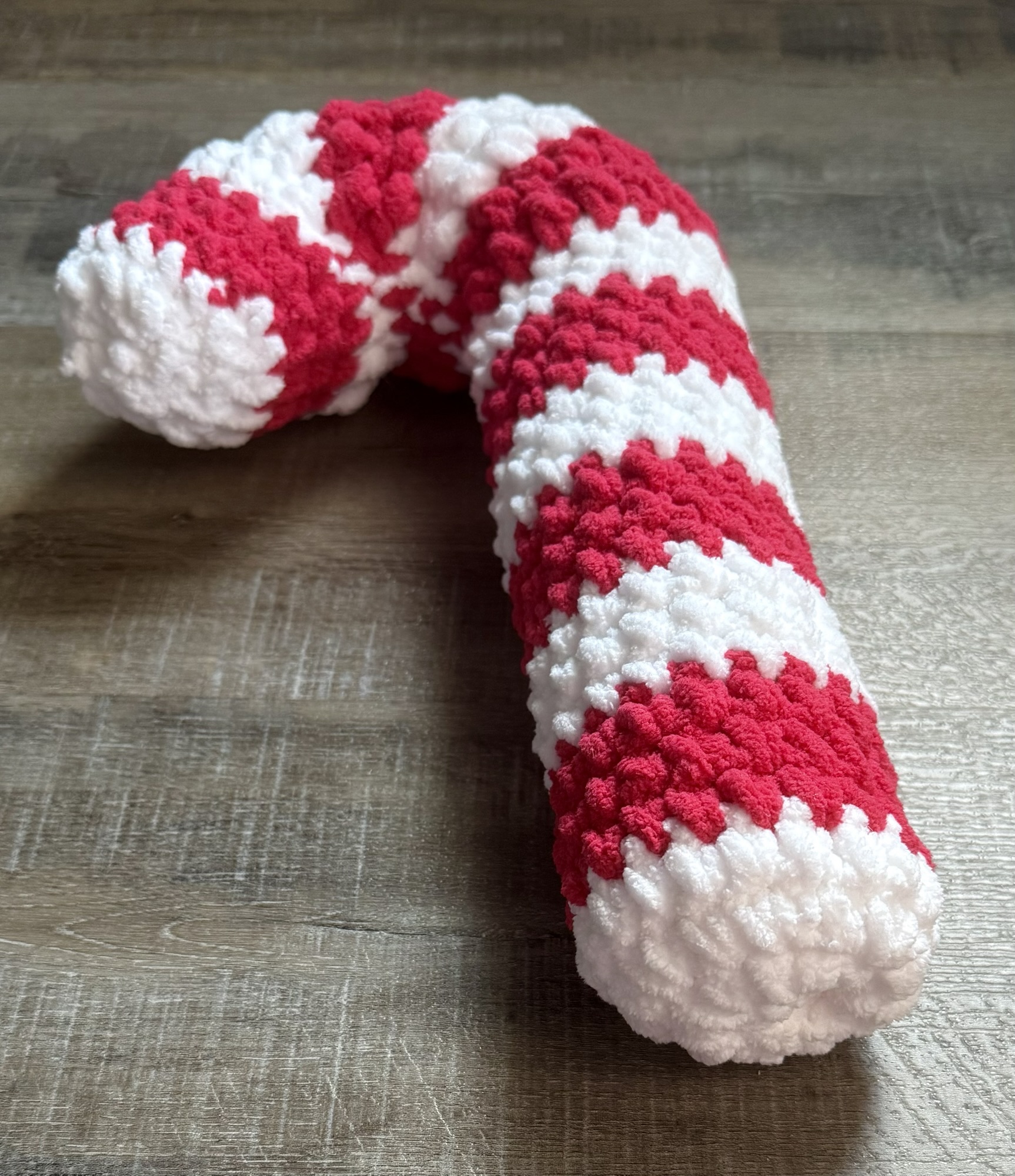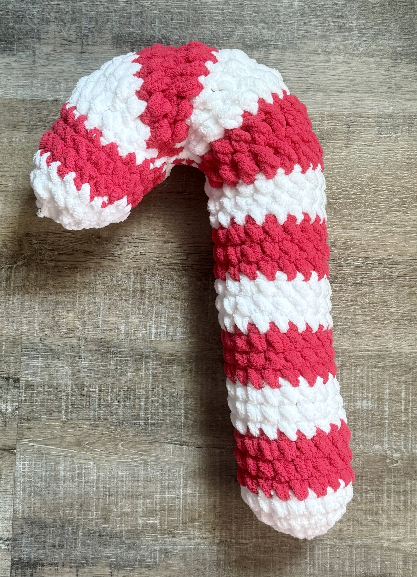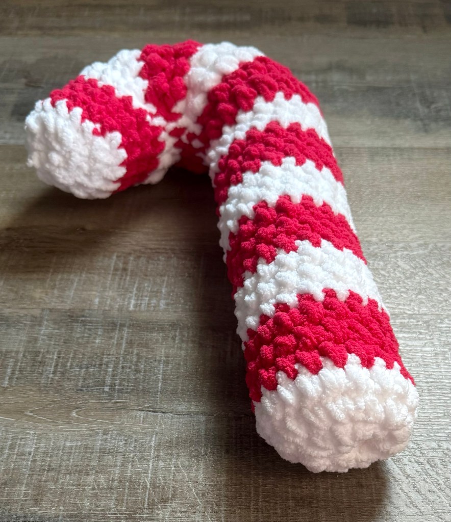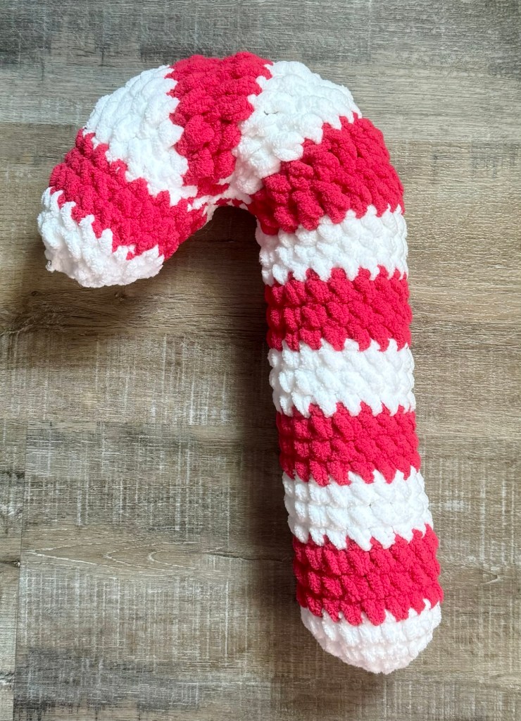 I used Yarn Bee Cozy Occasion yarn in White and Magenta (not sure what it’s called magenta 🤷♀️ – it really is more of a red) with an N/9mm hook to stitch up my Candy Cane Pillow. The pattern called for a different yarn and a 10mm hook so my Candy Cane Pillow came out a little smaller. The finished size of mine is about 14 inches tall with a circumference of about 9.5 inches. Still a fun size to use in your decor!