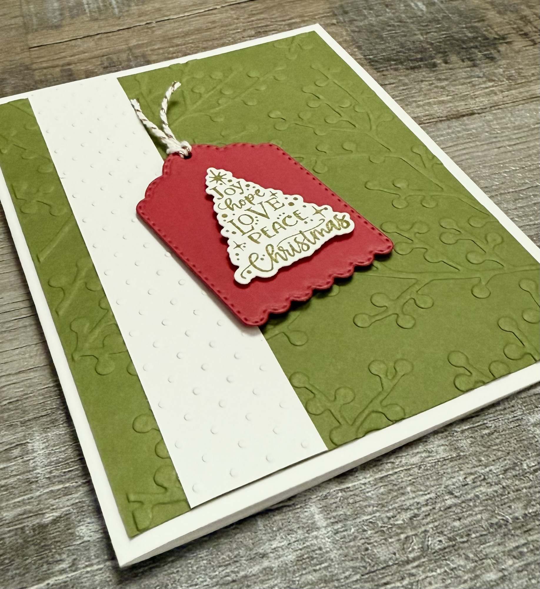 To make the card I embossed a piece of green card stock with a berry vine embossing folder (this is similar) and attached it to a white card. I embossed a strip of white card stock with a dot embossing folder and attached it to the card. The tag is attached to the card using foam tape.