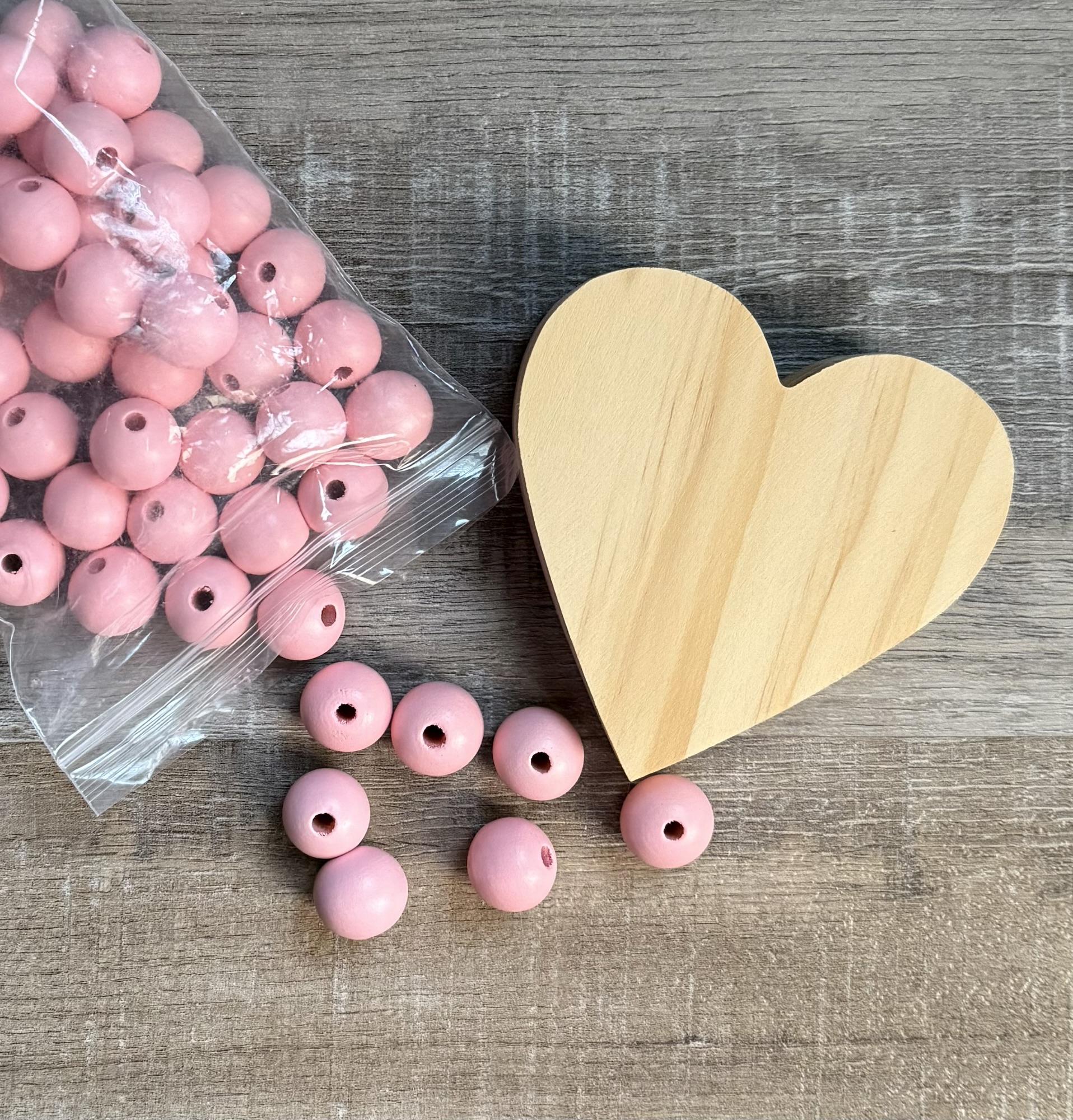 My wood heart measures 4 inches across and is 1 inch thick. I had it in my craft stash, but I think it came from Target. Everyone is putting out all the Valentine things so you may be able to find an unfinished wood heart at the craft stores. The pink beads are 20mm in size and you can find them here.