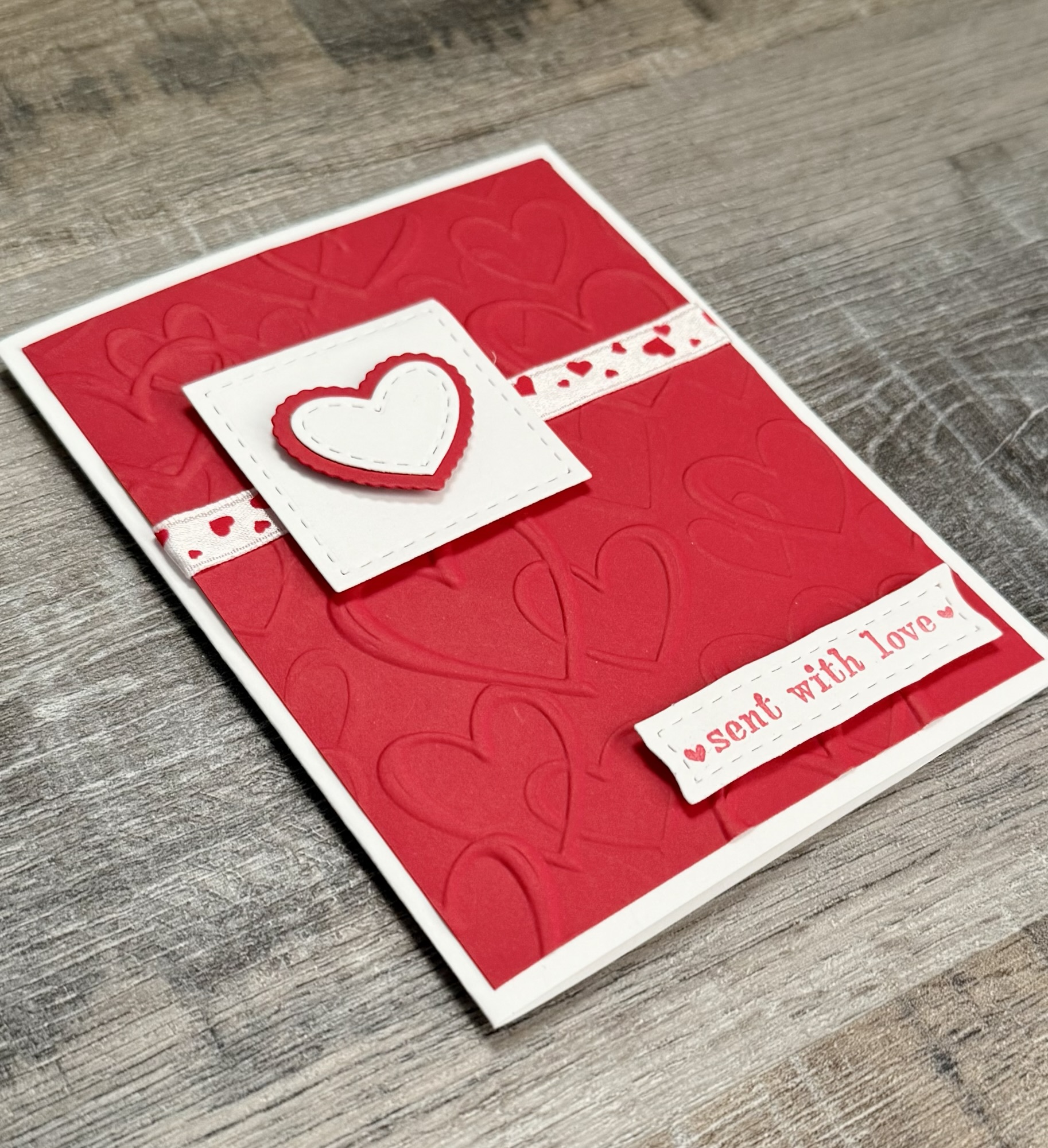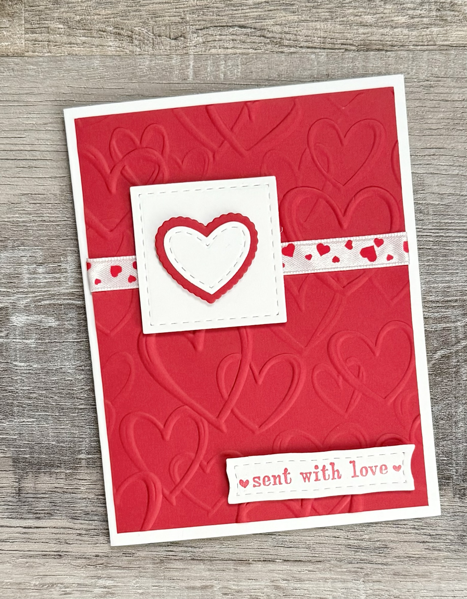 I embossed a piece of red card stock with this Sketched Hearts embossing folder, attached a heart printed ribbon to it, and attached the piece to a white card. I die cut a square from white card stock using this Scallops & Squares Nesting Dies set and attached it to the card with foam tape.