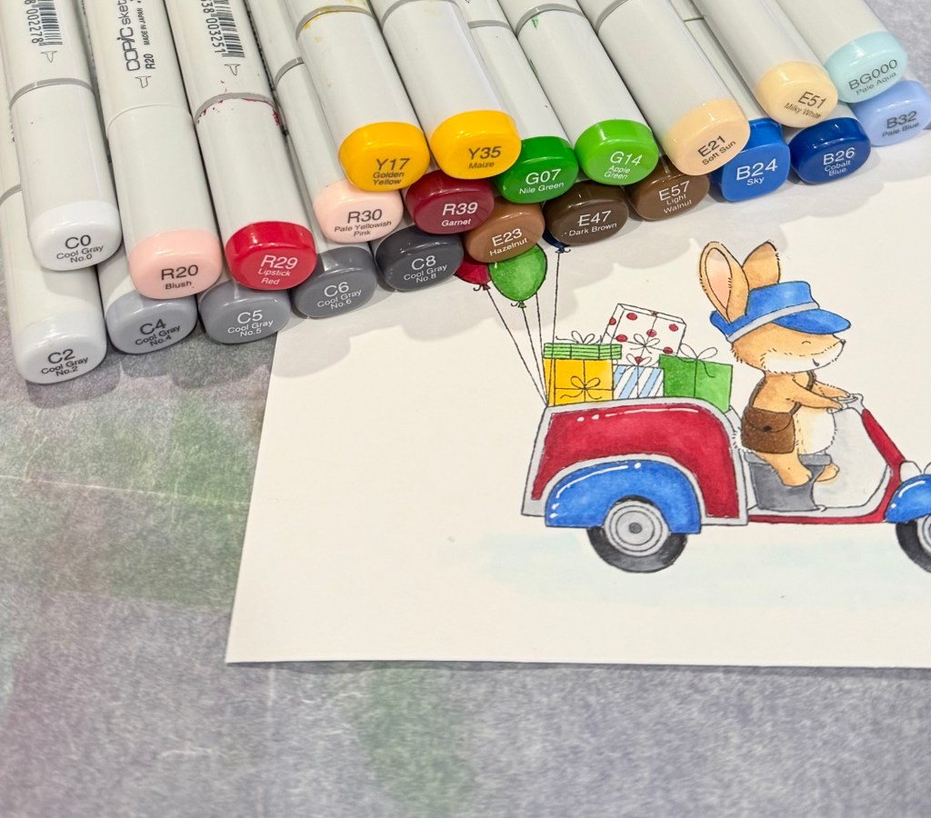I stamped the cute bunny image with Memento Tuxedo Black ink and colored it with Copic markers. Using a white gel pen, I added highlights to the scooter and balloons.