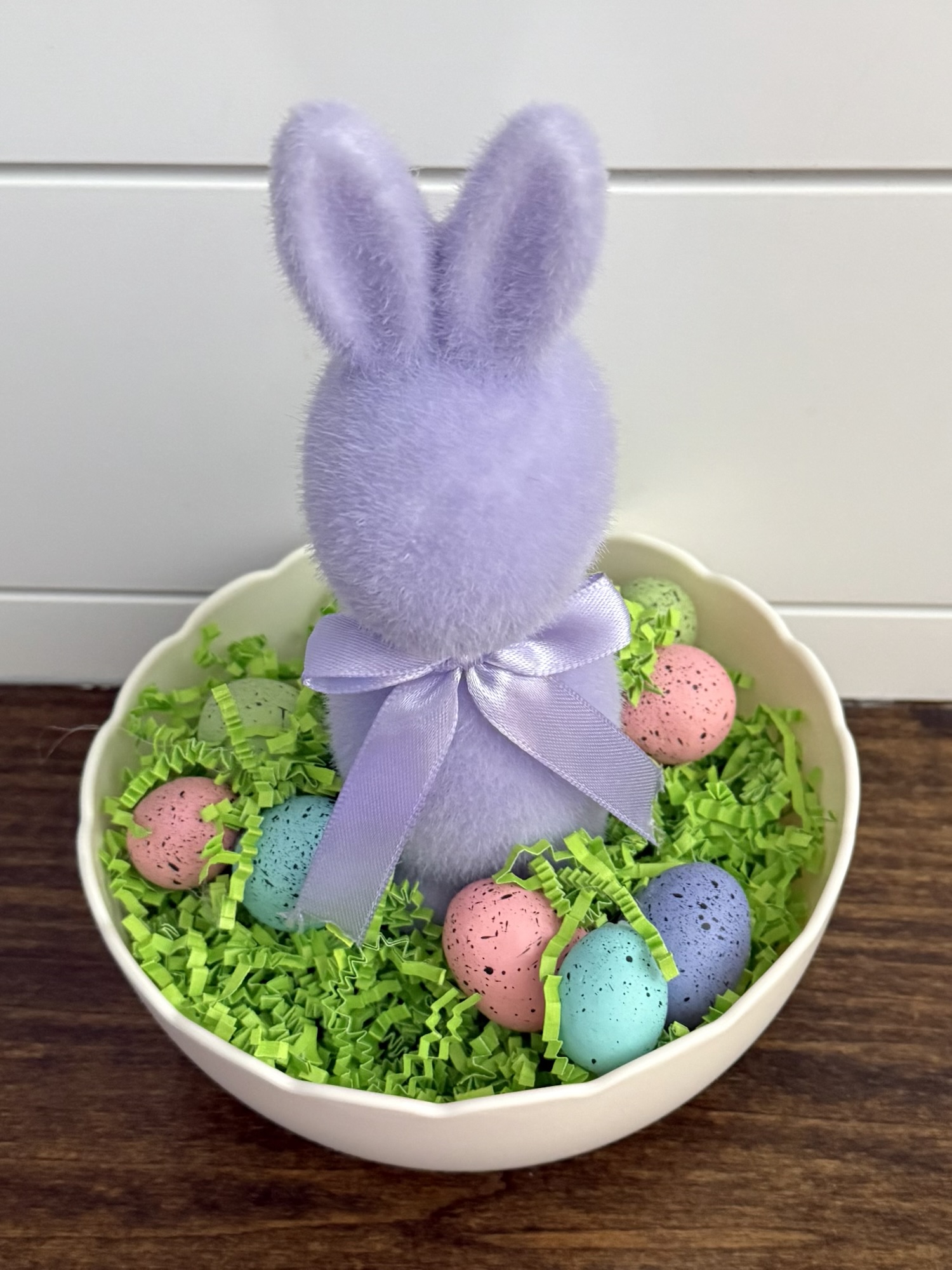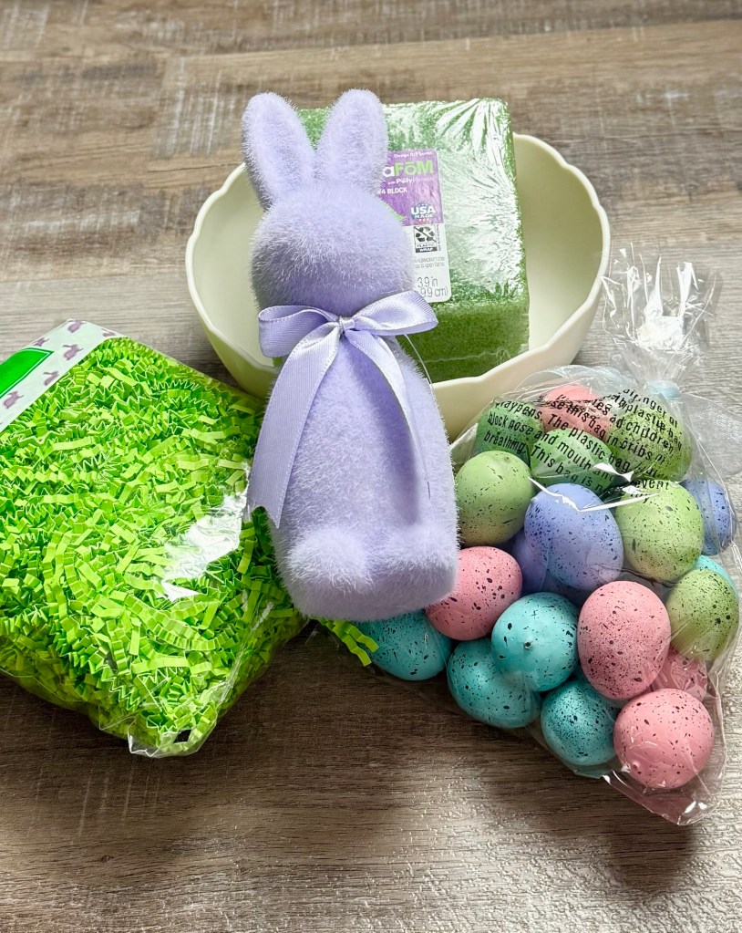 Along with the bunny, I used some floral foam, Easter grass shreds, and little speckled Easter eggs – all found at Hobby Lobby. You’ll also need a small container or basket for your arrangement. I used a small scalloped plastic bowl that I found at Walmart. The scallops reminded me of half an egg shell.😊