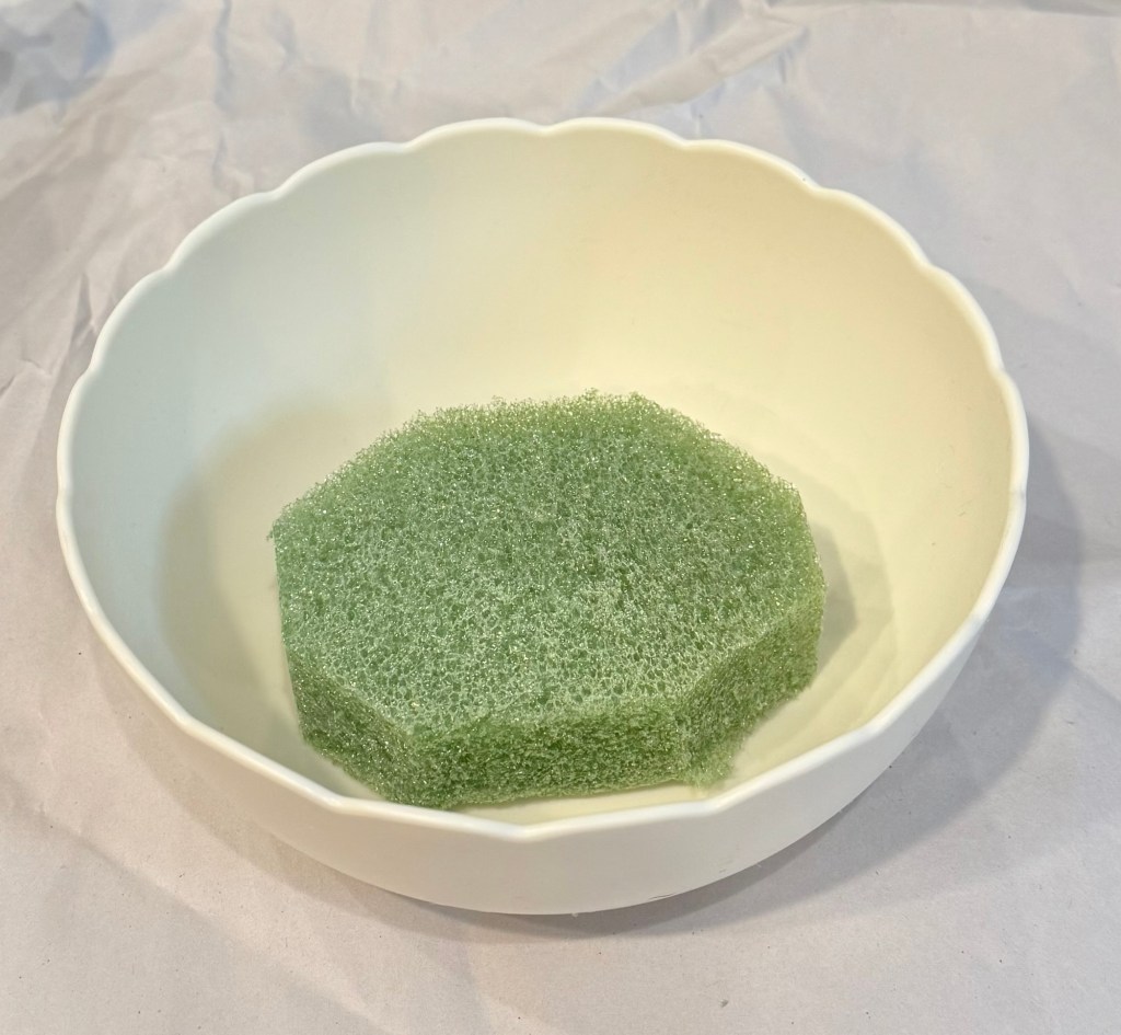 I cut off a piece of my floral foam about 1-inch thick and cut off the corners so it would fit in my bowl. I attached it to the bowl using hot glue.