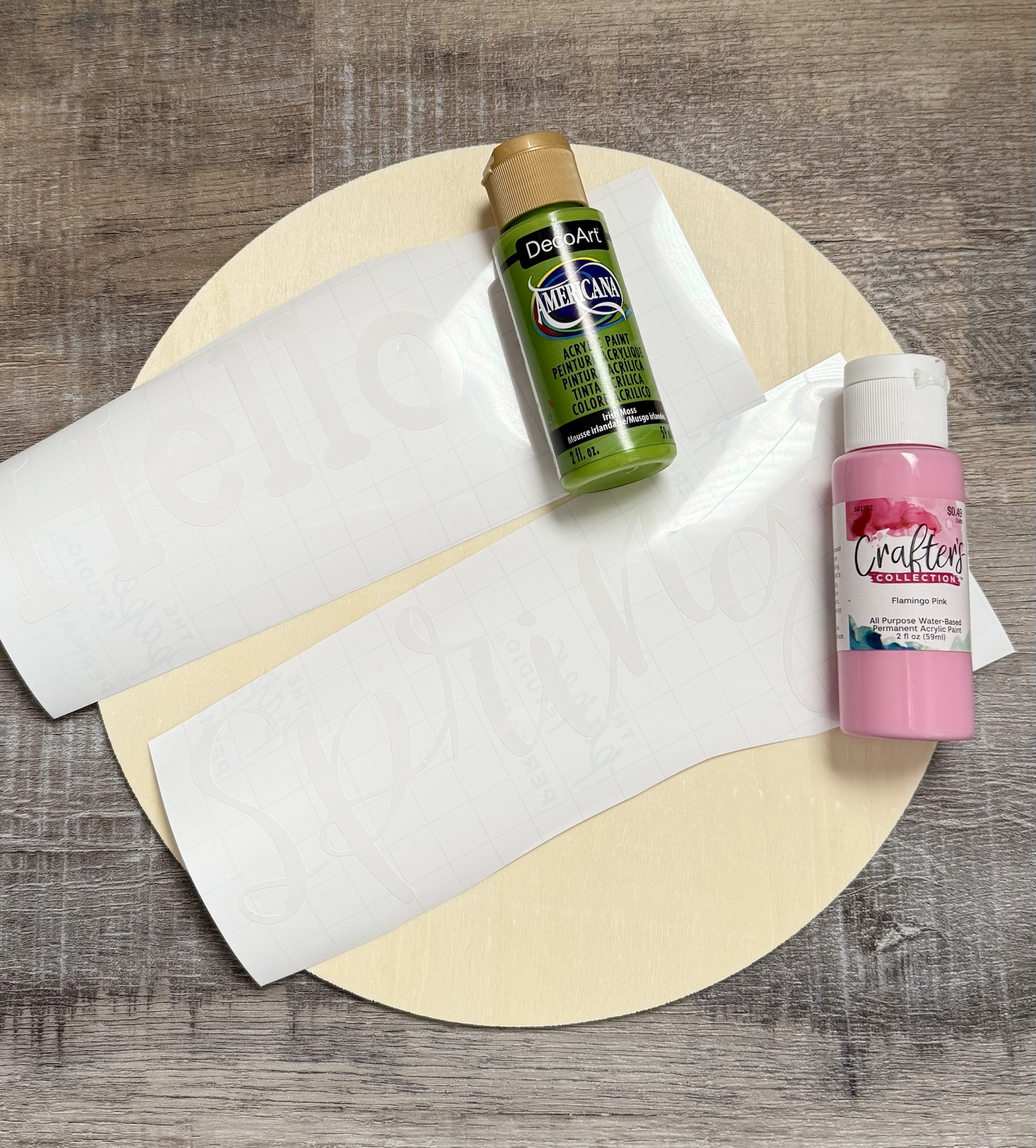 I used a 10-inch thin wood circle cutout to make my door hanger. You’ll also need some Spring color acrylic paints and masking or painters tape. I used my Cricut machine to cut my “Hello Spring” with permanent white vinyl. The words are kind of hard to see in the photo below because the background is white, but you can see them farther down in the post. I used 2 different fonts from Cricut Design Space and sized them to fit my circle. You could also use sticker letters or even paint the letters on if you’re much better at painting than I am!π