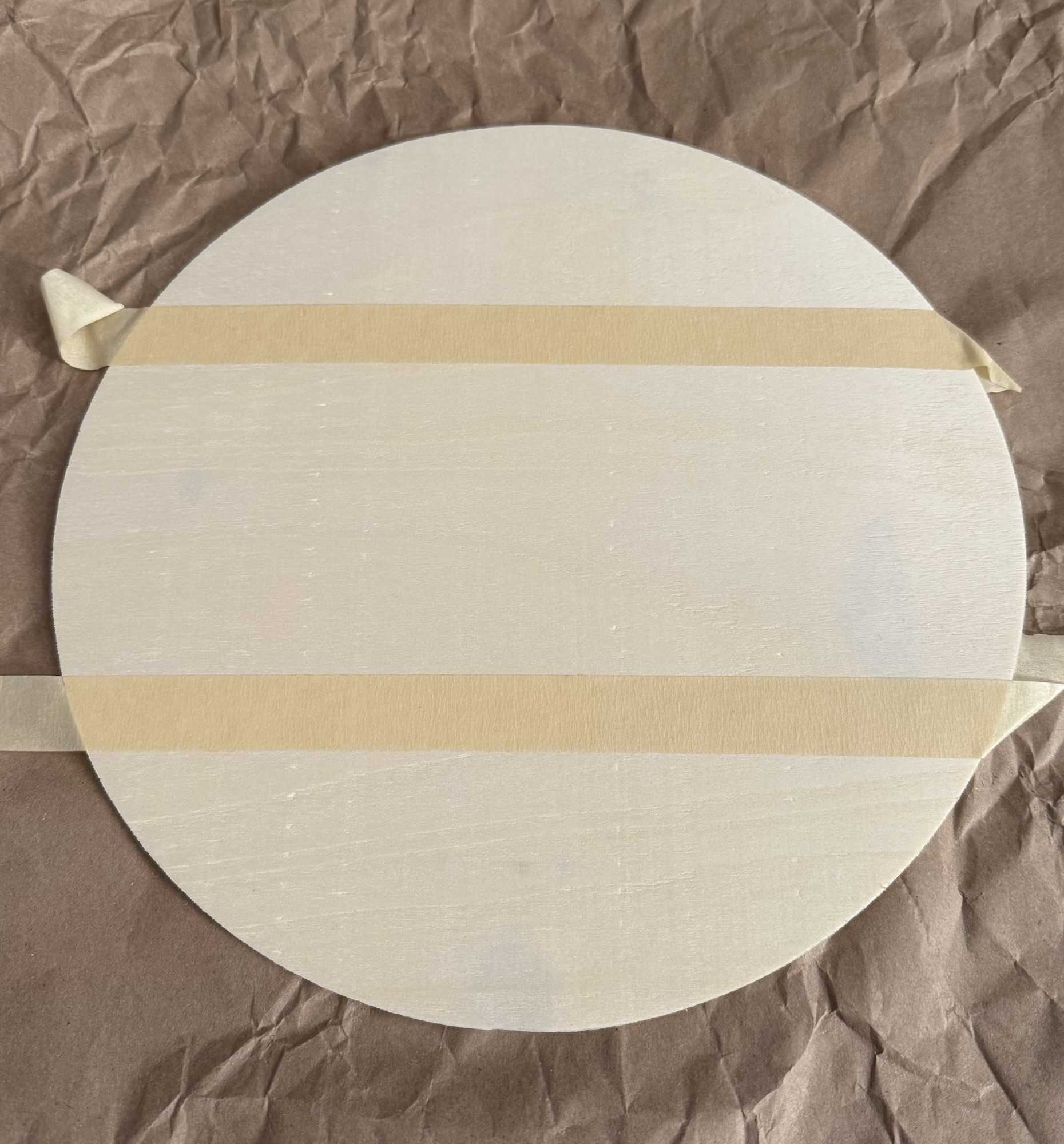 First, I taped off the circle to create 3 sections like in the photo above. I applied 2 coats of pink paint to 2 sections and 2 coats of green to the center section using a foam brush. Once the paint was completely dry, I carefully removed the tape.
